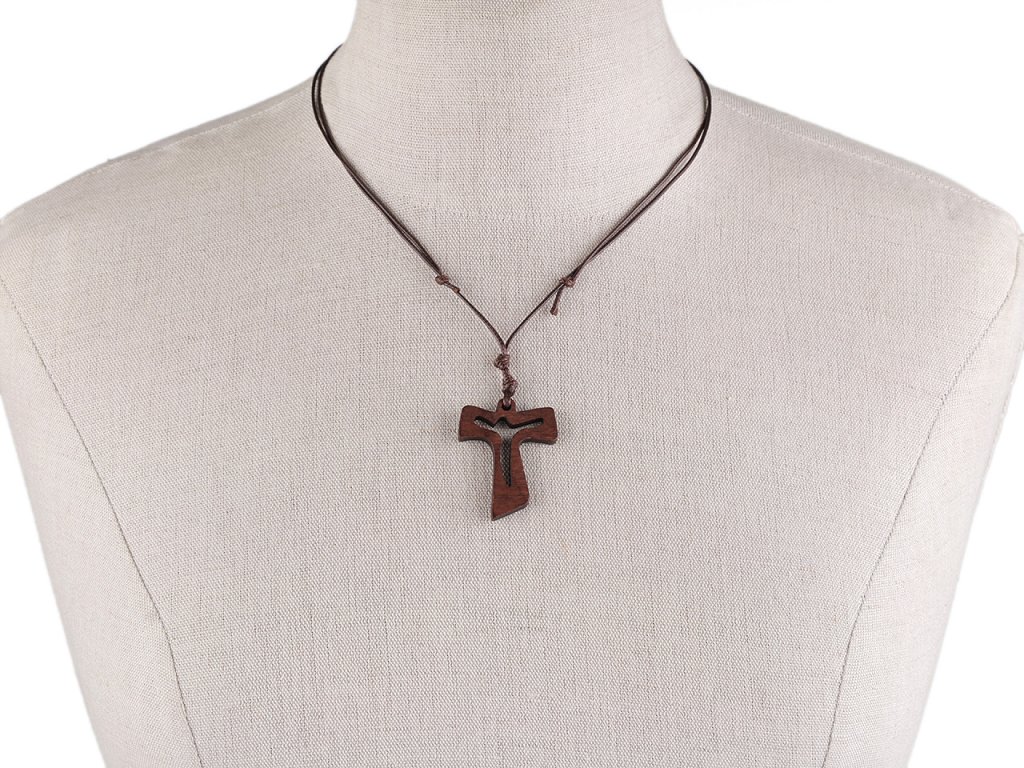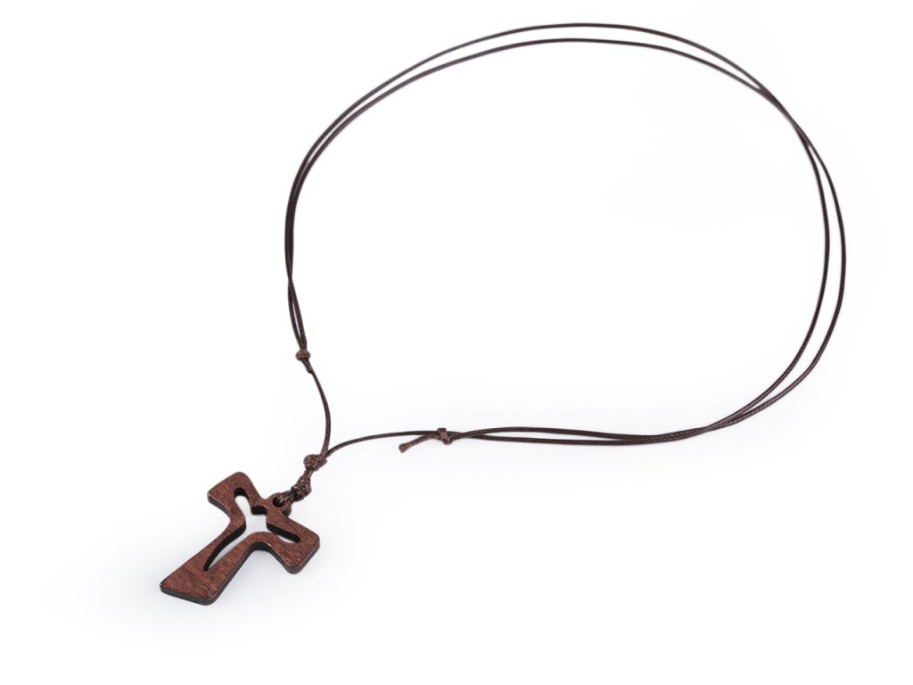 Náhrdelník zaujme pozornost svým dřevěným přívěskem kříže. Nemá zapínání, jeho délku si můžete upravit pomocí posuvných uzlů.
