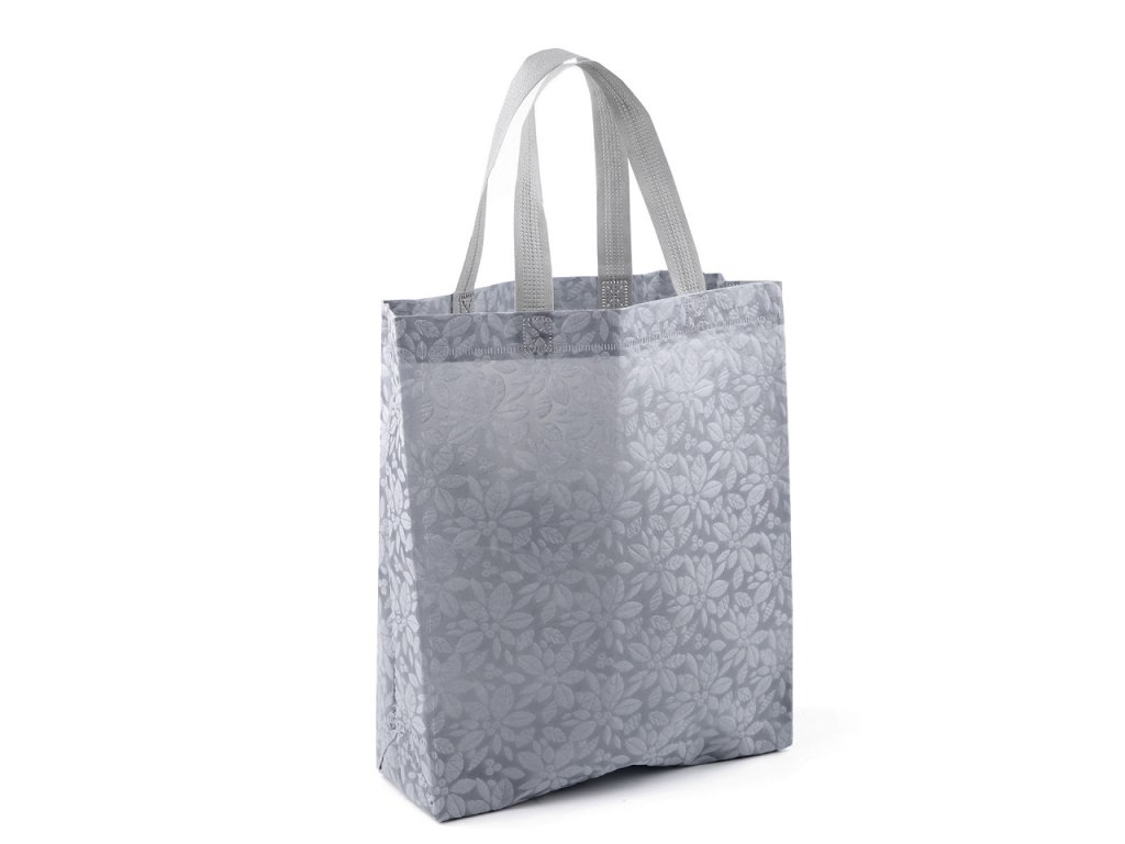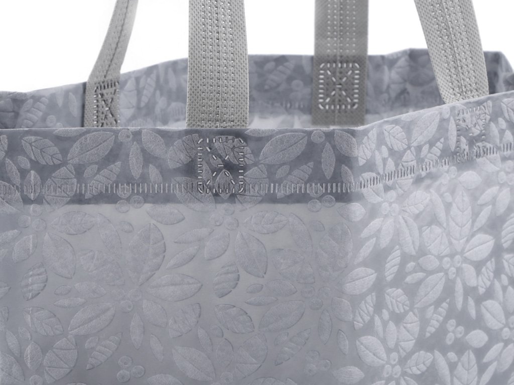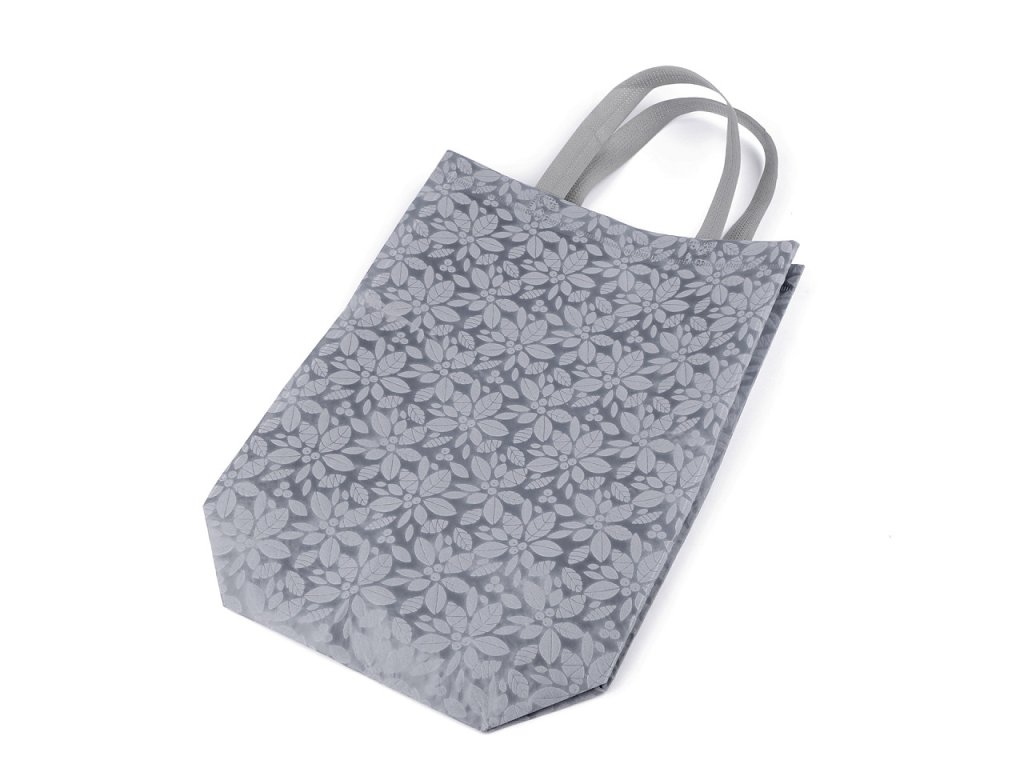 Do tašky z [laminované] netkané textilie se vzorem květů naskládáte plno věcí. Má dvě ucha, skvěle se složí třeba do kabelky. Díky opakovanému používání je šetrná k životnímu prostředí, stále častěji nahrazuje igelitové tašky. Není určená na těžké nákupy.