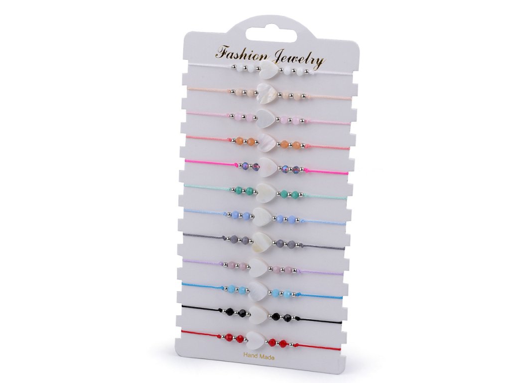 Náramky s perleťovým srdíčkem jsou dokonalým doplňkem letního outfitu. Hodí se jak k šatům, tak k halenkám, tričkům i plavkám. Prodávají se jako sada 12 ks na papírové kartě k zavěšení, každý náramek má jinou barvu.