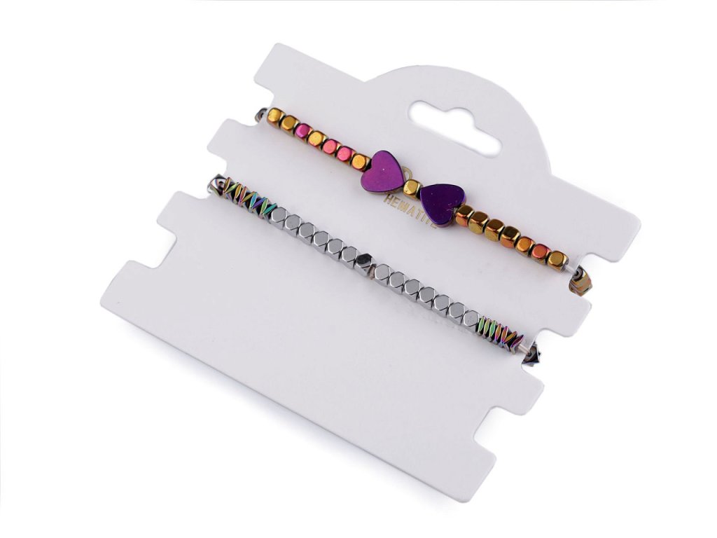 Sada 2 elegantních náramků vyrobených z broušených korálků pokoveného hematitu. Jeden je ozdobený motivem mašle. Díky pružence se náramky snadno natahují na ruku, mají univerzální velikost. Patří mezi šperky, které díky své fascinující povrchové úpravě zaujmou na první pohled. Broušené plošky vytvářejí efektní světelné odlesky. Náramky potěší každou ženu, jsou dárkem, se kterým nešlápnete vedle. Hodí se ke slavnostním příležitostem, skvěle podtrhne i business styl oblékání.