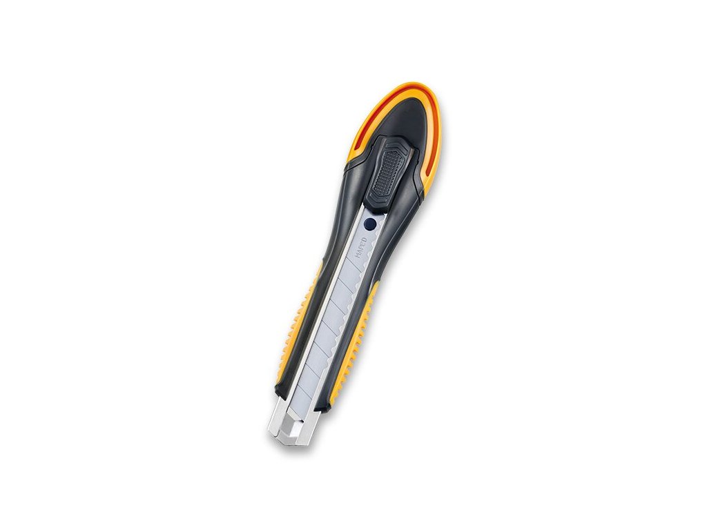 Odlamovací nůž se speciálně upraveným úchopem pro pohodlné držení jak v místě dlaně, tak v místě položení ukazováčku. Zatahovatelné odlamovací břity o šíři 18 mm, integrovaná pojistka.
