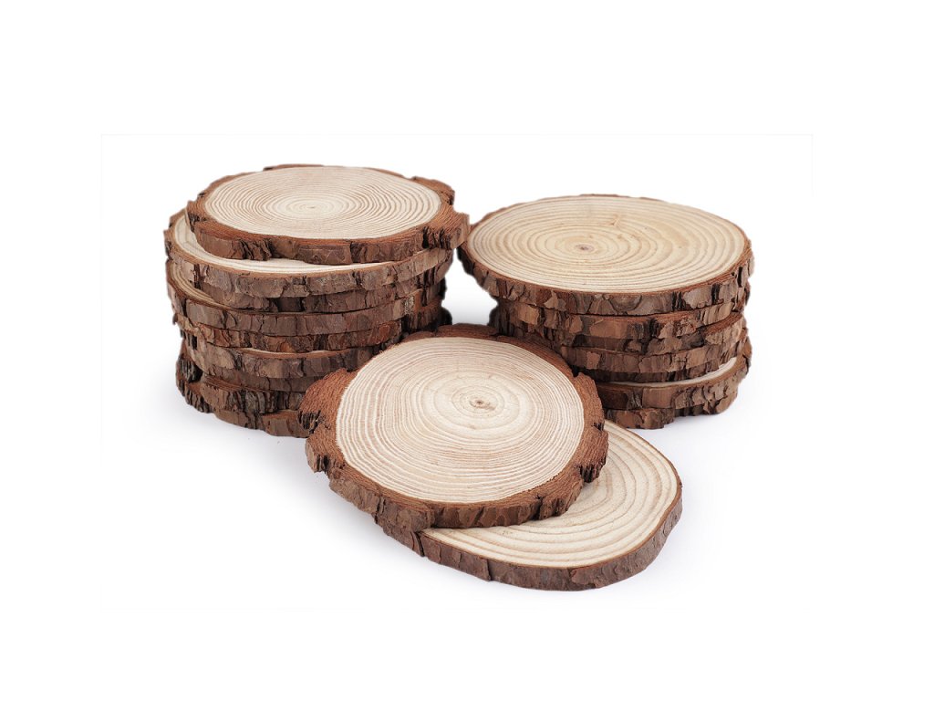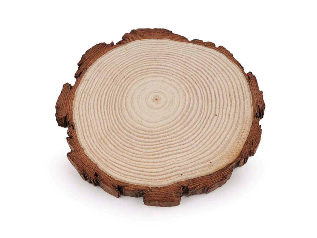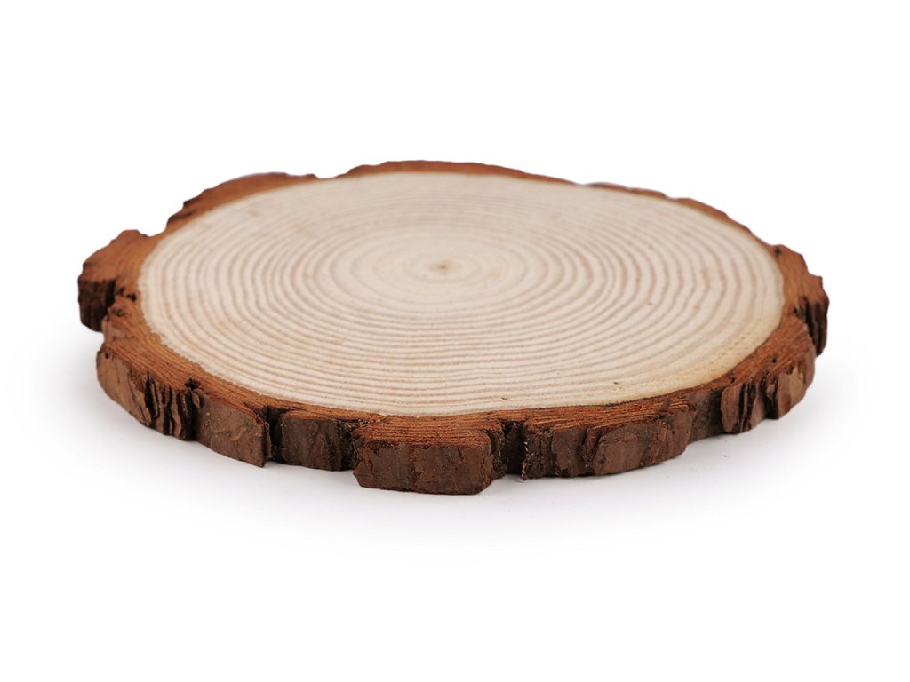 Kolečko z přírodního dřeva se hodí k dalšímu dotvoření. Je rovné, po obvodu má kůru. Není barvené ani lakované, každý kus se může lišit jak barvou, tak kresbou dřeva, velikostí i tloušťkou.