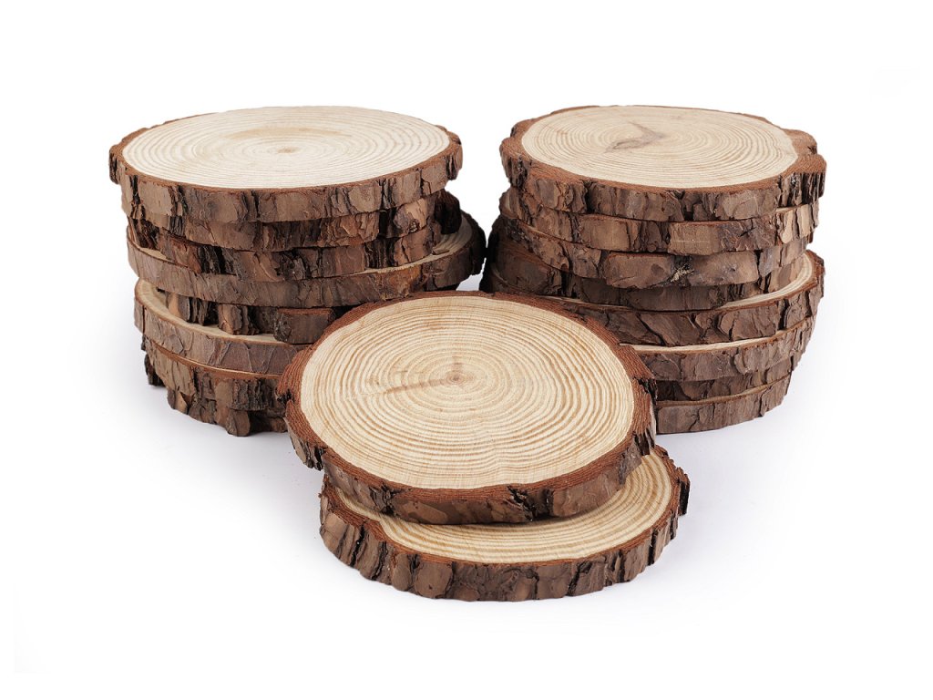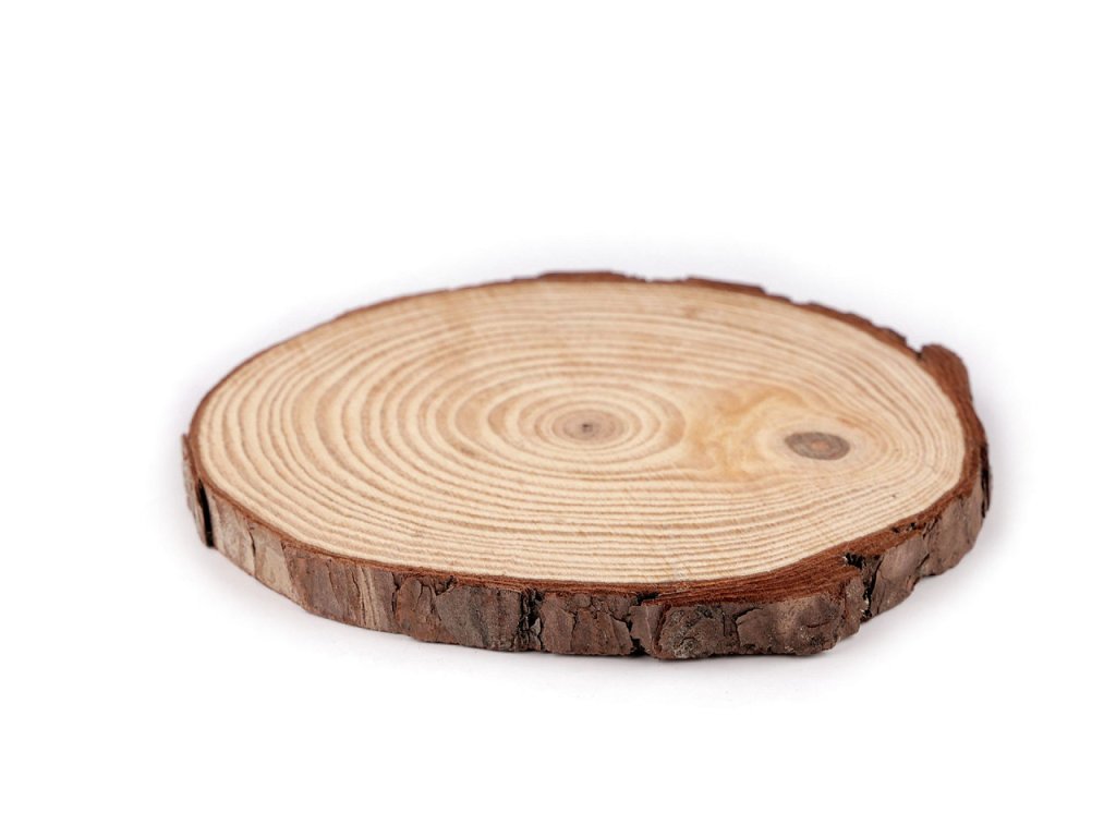 Přírodní dřevěné kolečko se hodí k dalšímu dotvoření. Je rovné, po obvodu má kůru. Není barvené ani lakované, každý kus se může lišit jak barvou, tak kresbou dřeva, velikostí i tloušťkou.