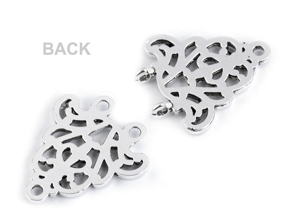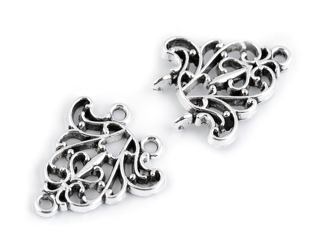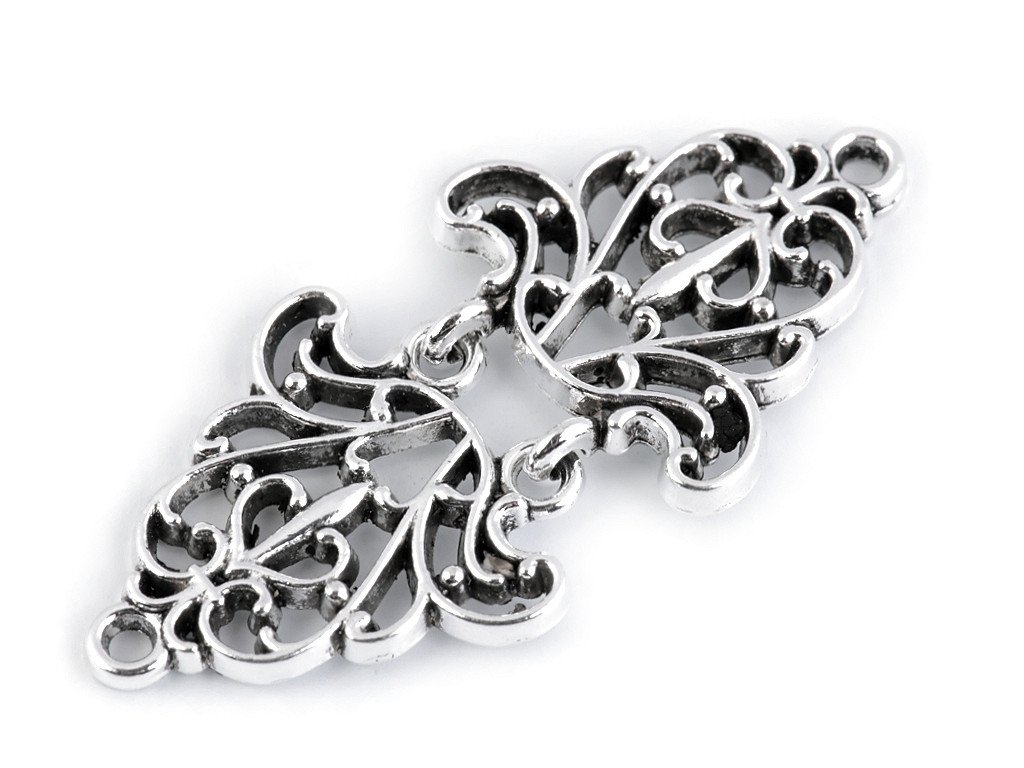 Ozdobné zapínání s filigránovým motivem se skládá ze dvou protikusů, kdy na jednom jsou dva háčky a na druhém dvě očka.Použití: Využijete ho na kabelky, halenky či kabátky, ale také si s jeho pomocí můžete udělat efektní pásek.