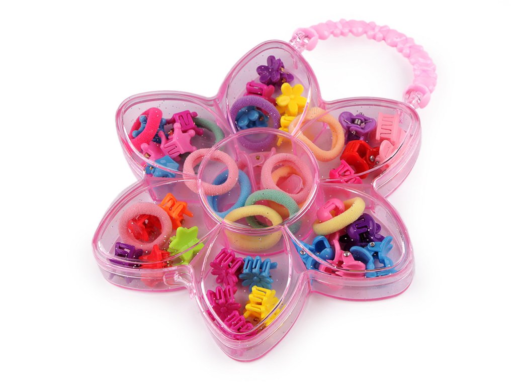Sada malých ozdob a gumiček do vlasů je ideální pro holčičky, které rády vytvářejí zajímavé účesy. Všechny pomůcky jsou ukryté v transparentním boxu s uchem.