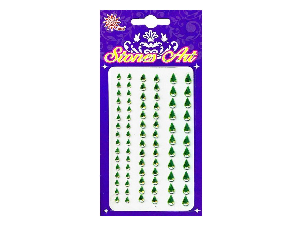 Samolepicí kamínky - zelené kapky 82 ks, velikost balení 8x15 cm. Velikost kapek - 0,4 cm, 0,5 cm a 0,7 cm. Jednotlivé kamínky lepte na čisté místo.