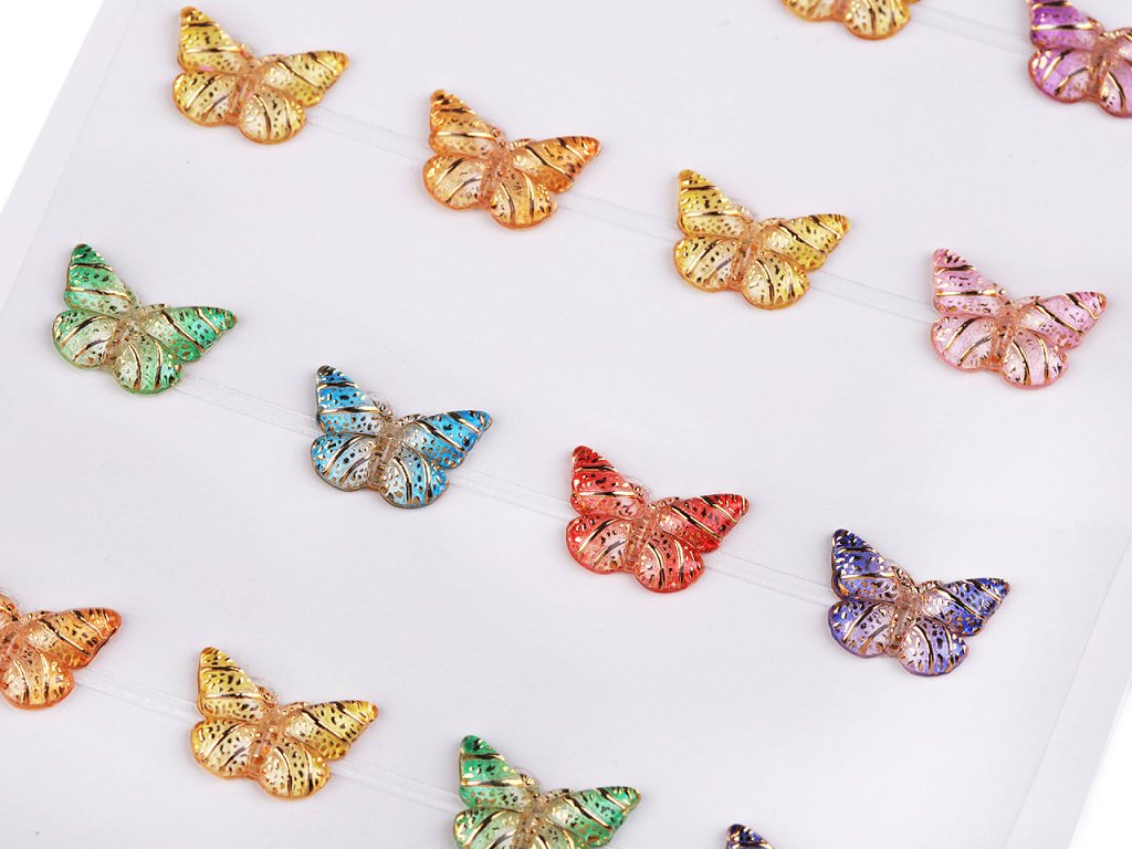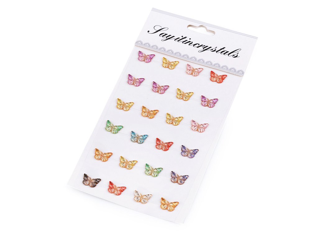 Kamínky ve tvaru motýlků jsou velice poutavé, mají jemné probarvení se zlatým potiskem žilek. Všechny jsou nalepené na jednom archu podkladové folie, ze které je stačí sejmout. Motýlci jsou v řadách navzájem spojení lepícím proužkem, takže tvoří pásky. Celkem zde najdete 6 pásků (v každém jsou 4 motýlci). Můžete je i nastříhat na jednotlivé kousky.