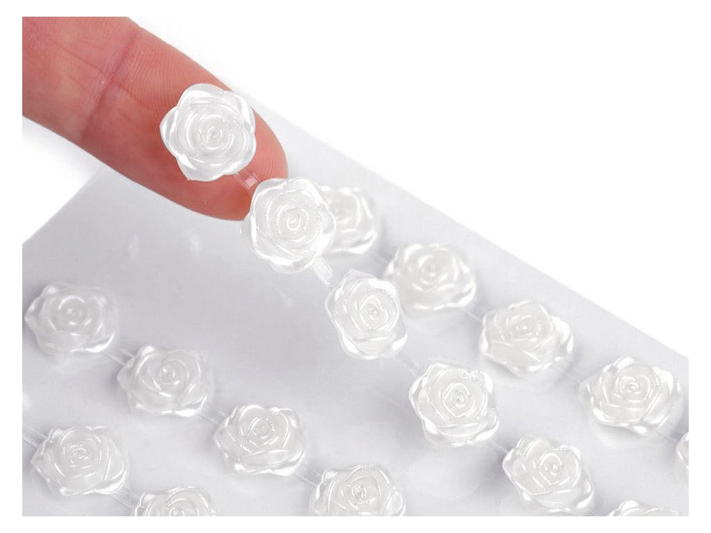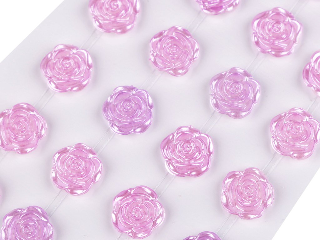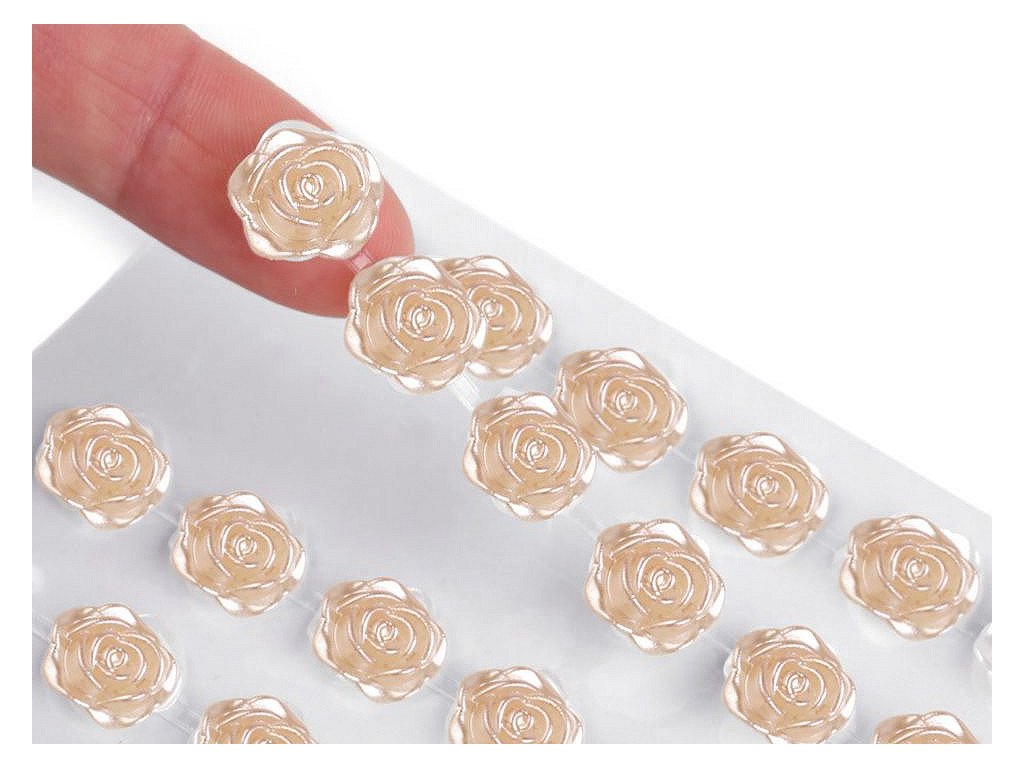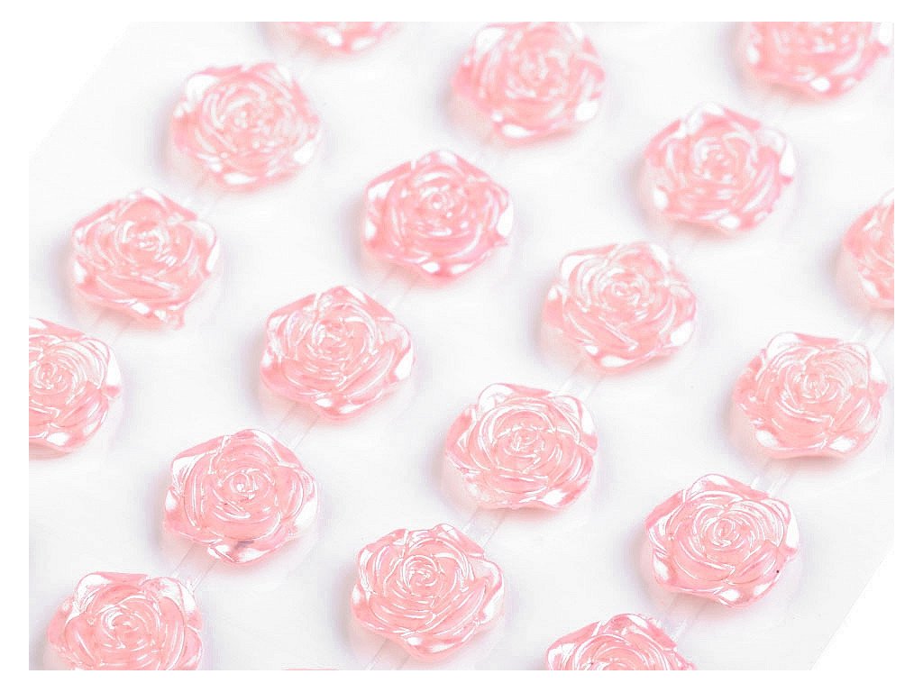 Kamínky ve tvaru růží s perlovým leskem vypadají úžasně. Všechny jsou nalepené na jednom archu podkladové folie, ze které je stačí sejmout. Růže jsou v řadách navzájem spojené lepícím proužkem, takže tvoří pásky. Můžete ho i jednotlivě nastříhat.