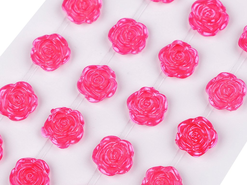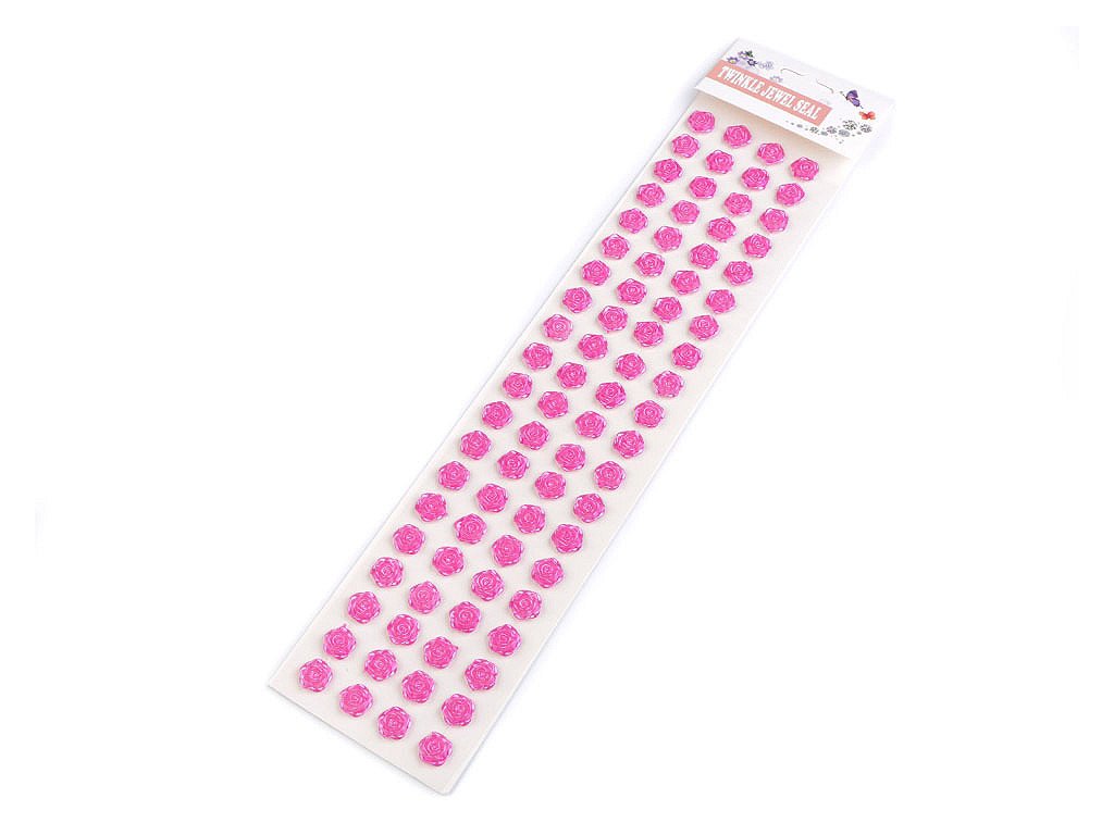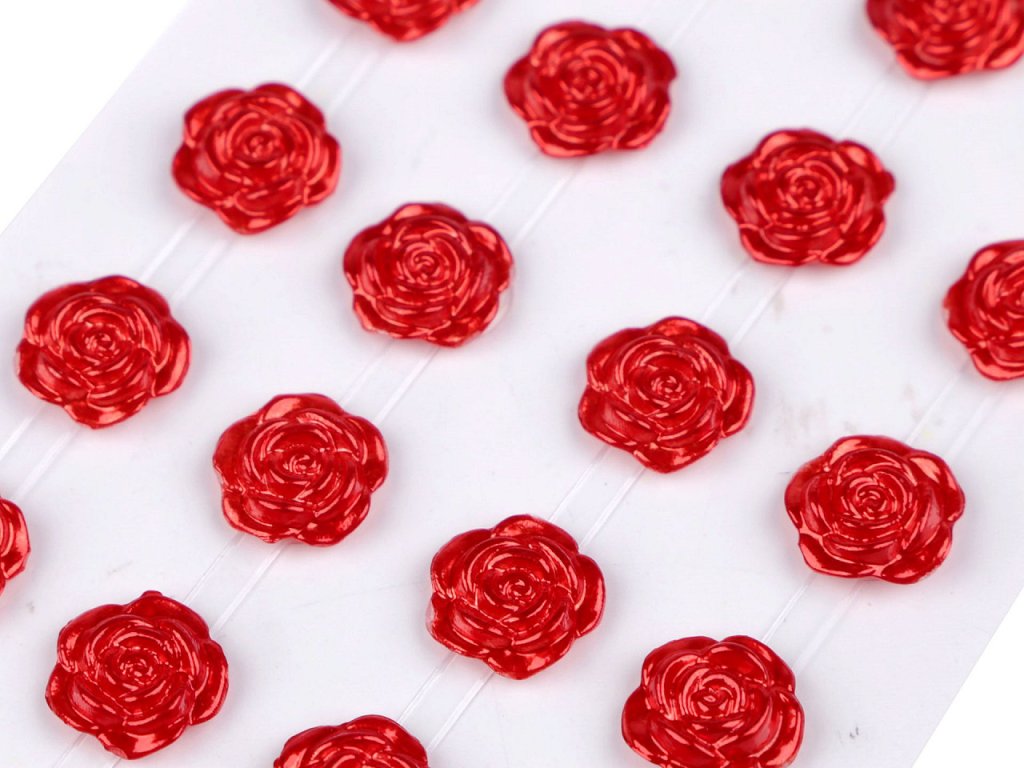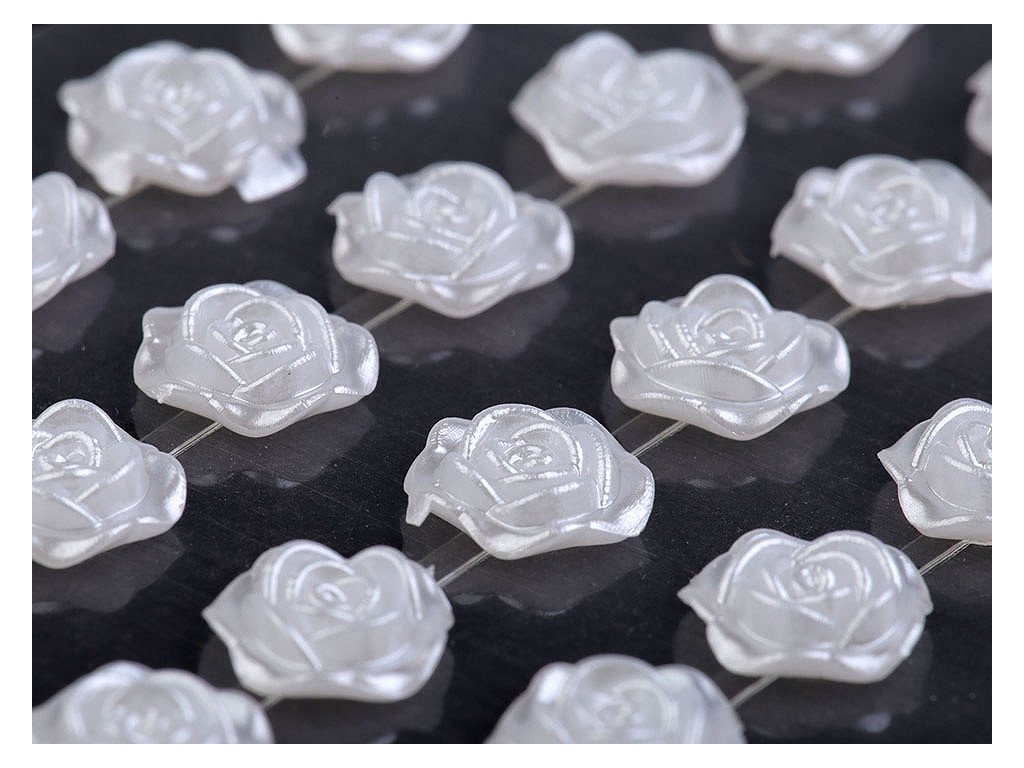 Kamínky ve tvaru růží s perlovým leskem vypadají úžasně. Všechny jsou nalepené na jednom archu podkladové folie, ze které je stačí sejmout. Růže jsou v řadách navzájem spojené lepícím proužkem, takže tvoří pásky. Můžete ho i jednotlivě nastříhat.