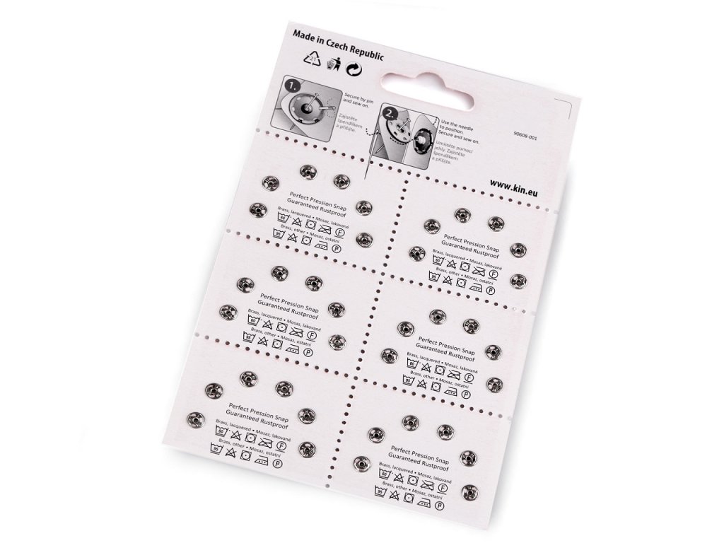 Knoflík se používá k zapínání různých částí oděvů. Stiskací knoflík se skládá ze dvou částí: díl pérová část a díl kulička. Jedná se o přišívací patenty. Na jedné kartě je 6 ks patentů.