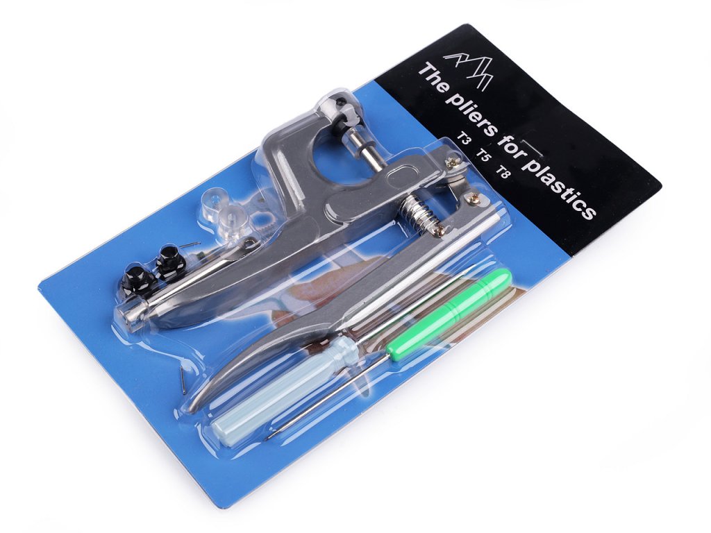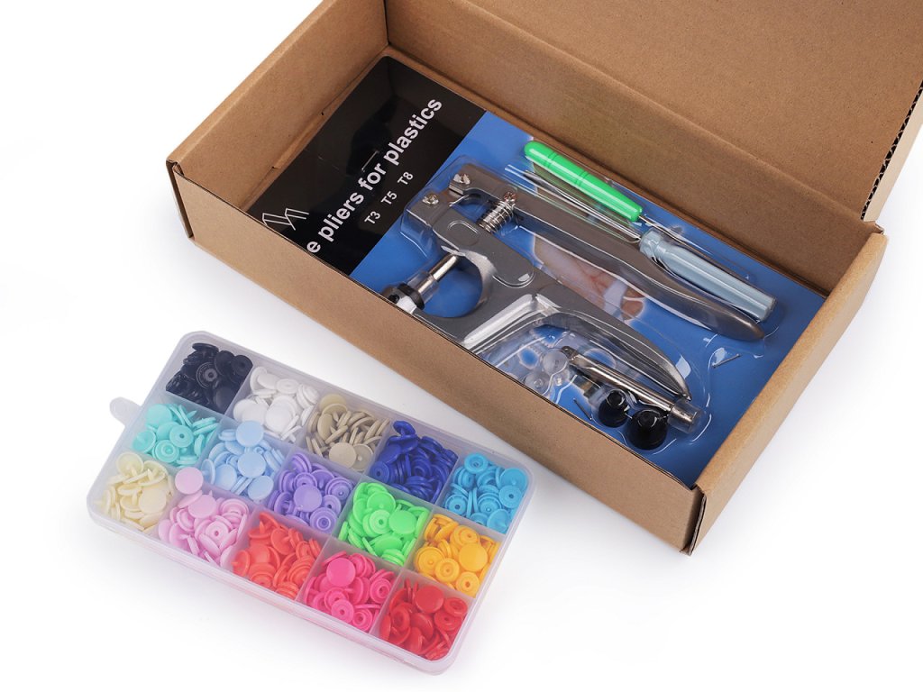 Plastové patentky využijete jako zapínání na oblečení a doplňky. K aplikaci vám pomůže ruční lis, který je součástí sady.