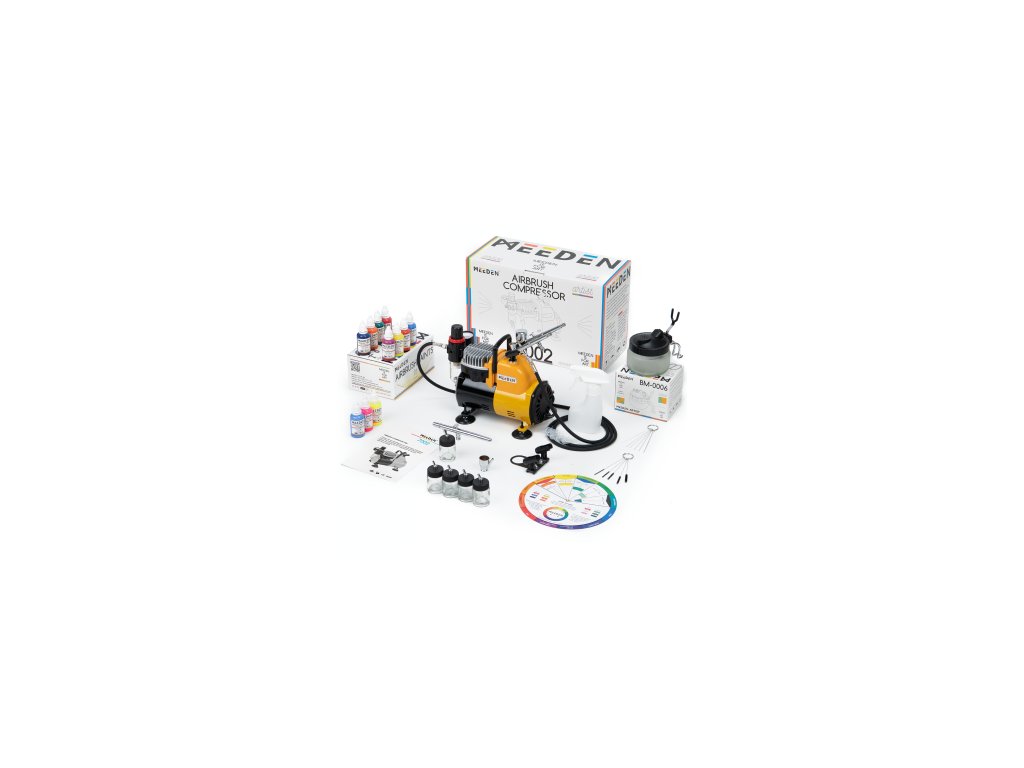 Tato kompletní sada obsahuje vše potřebné pro airbrush, včetně kompresoru. Kompresor poskytuje stabilní tlak vzduchu s průtokem 20-23 l/min a je poháněný motorem o rychlosti 1450/1750 ot./min. Má nízkou hlučnost (47 dB), neobsahuje maziva a je vybavený funkcí automatického vypnutí jako ochrana proti přehřátí. Součástí balení je odnímatelný držák na dvě airbrush pistole. Pistole mají trysku 0,5 a 0,25 mm s horním plněním a 0,35 mm se spodním plněním, včetně 5 náhradních lahviček pro spodní plnění. V balení najdete také 22 klasických barev a 2 fluorescenční airbrush barvy (svítící). Pigmenty v barvách jsou jemně namleté a neucpávají trysky. Sadu ocení zkušení umělci i začátečnící v airbrush technice.