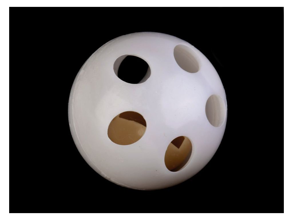 Chrastítko má tvar kuličky, ve které jsou v sobě ještě další 2 kuličky, které vydávají rolnivý zvuk.