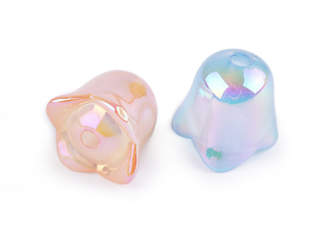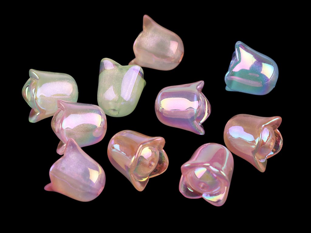 Barevný mix plastových korálků ve tvaru tulipánu nebo zvonku nadchnou děti i dospělé. Jsou doslova magické, protože jsou transparentní, ale povrch má vysoký perleťový lesk s AB efektem.
