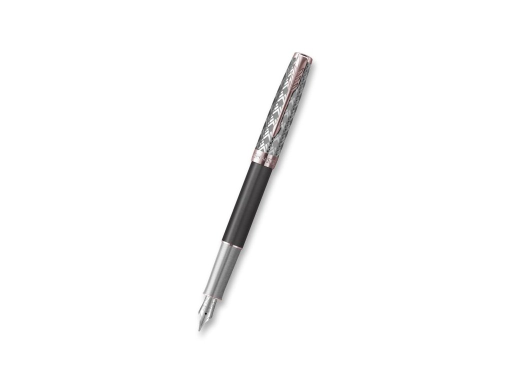 Plnicí pero Parker Sonnet Premium Metal Grey PGT má šedě lakované tělo a víčko z leštěné nerezové oceli se zdobným vzorem vytvořeným leptáním. V kombinaci s doplňky pokovenými růžovým zlatem. Hrot z 18karátového zlata (ryzost Au 750/1000) s křížovou rytinou, pokovený rhodiem.