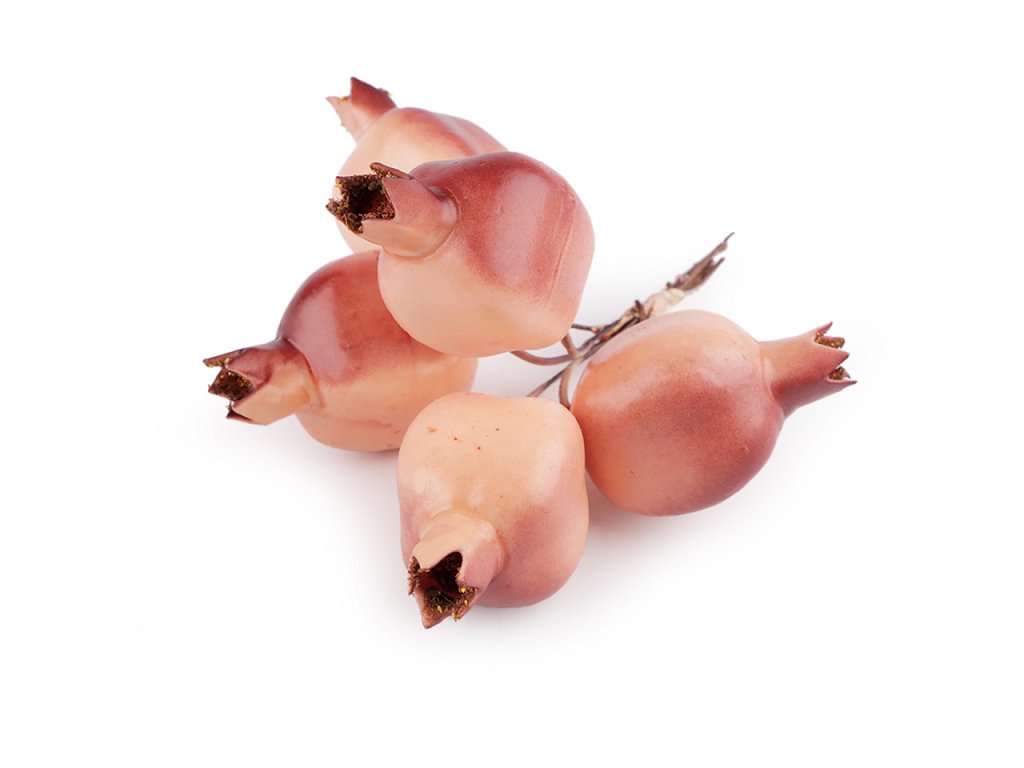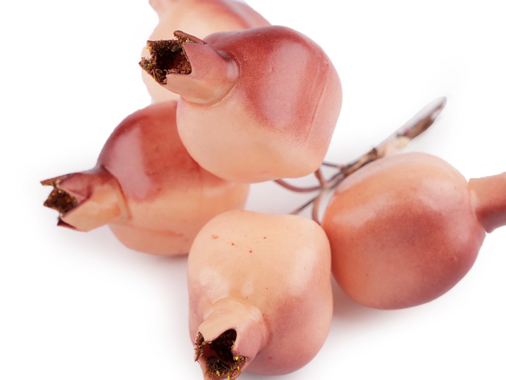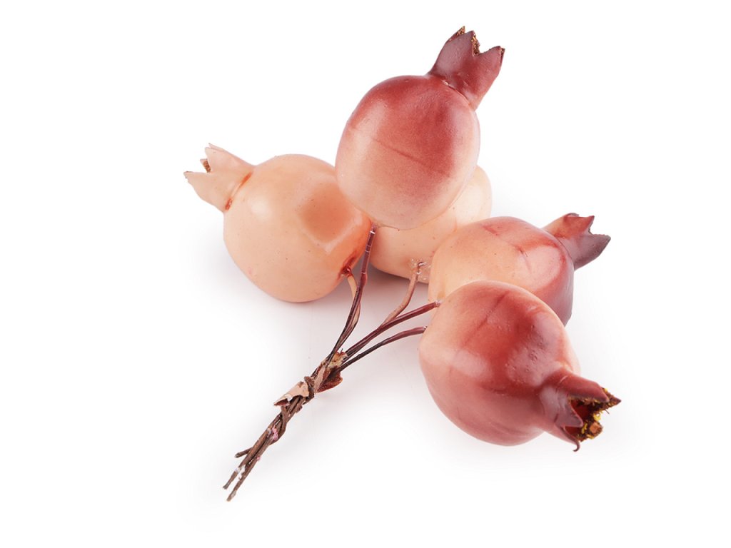 Dekorační granátová jablíčka jsou připevněná na drátku, díky kterému se dají tvarovat. Lehce se zapichují do polystyrenových polotovarů, věnců, podzimních vazeb apod.