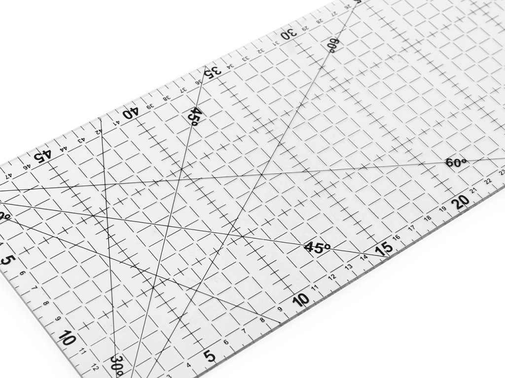 Velké plastové pravítko oceníte pro jeho univerzálnost. Je pevné, dá se využít nejen na techniku patchwork, ale i na další ruční práce jako jsou quilting, scrapbooking a šití. Vyznačené jsou hodnoty po půl cm a úhly 30°, 45° a 60°.