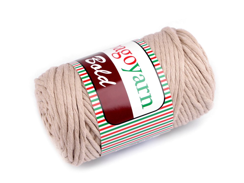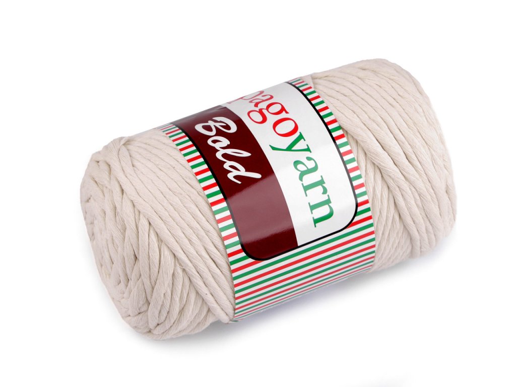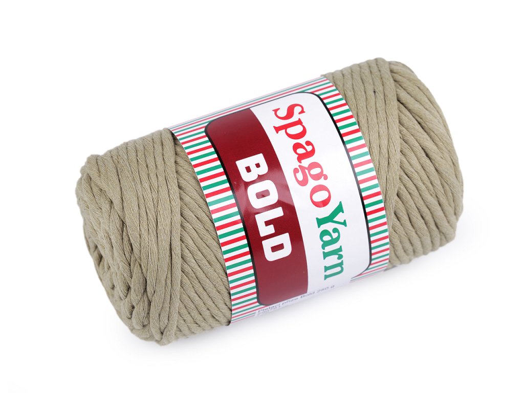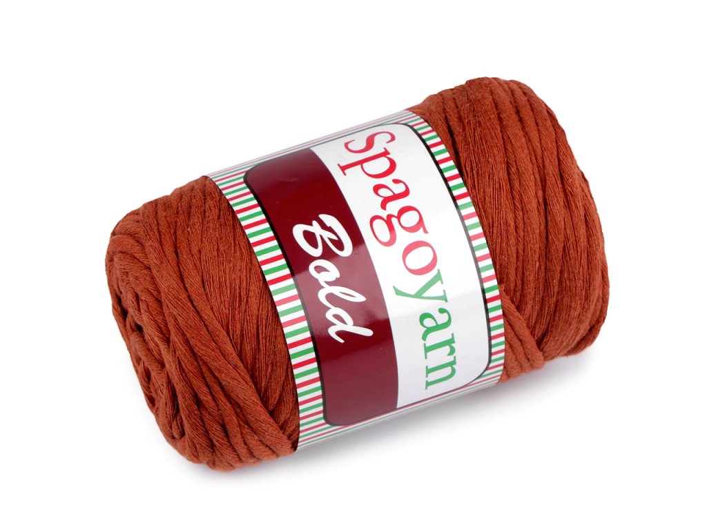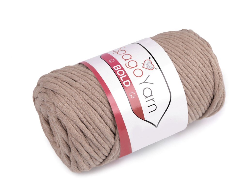 Bavlněná pletací příze Spagoyarn Bold je volně stočená špagátová příze, kterou využijete na pletení a háčkování koberečků, tašek, kabelek a jiných různých doplňků. Díky svému provedení je ideální na techniku macramé (drhání). Skvěle se s ní pracuje a dá se hezky rozčesat. Můžete z ní vyrobit různé interiérové doplňky nebo závěsné dekorace.