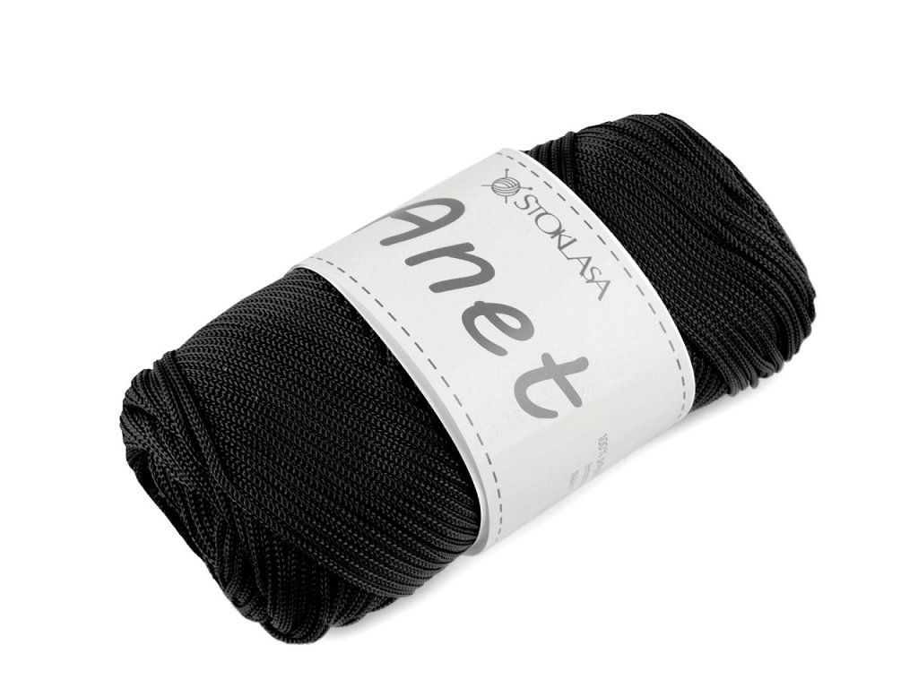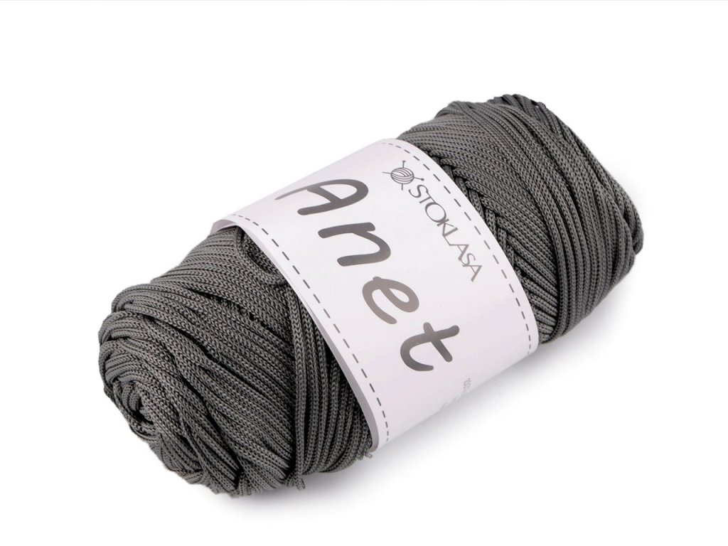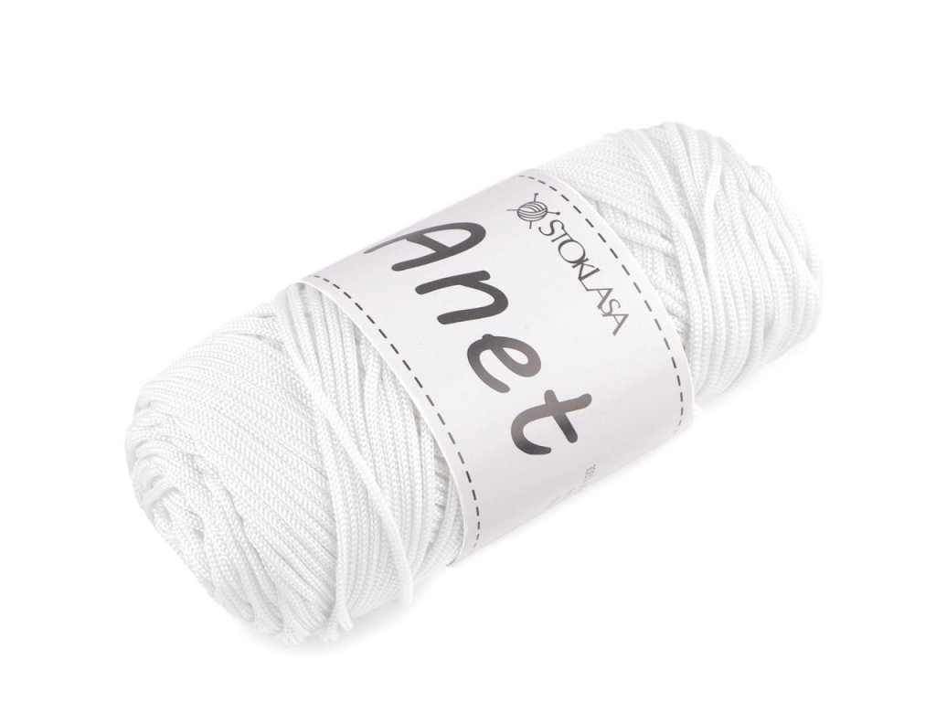 Pletací příze Anet připomíná provázek a má jemně lesklý povrch. Hodí se na pletení a háčkování tašek, košíků a podobných výrobků i na techniku macrame.