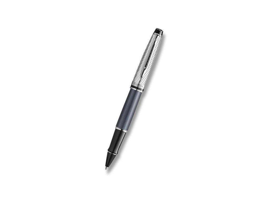 Roller Waterman Expert Deluxe Metalic Stone CT má šedě lakované mosazné tělo a víčko s reliéfní rytinou vyvedenou leptáním. Pero je v kombinaci s doplňky pokovenými palladiem.