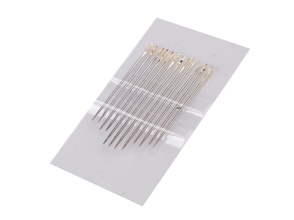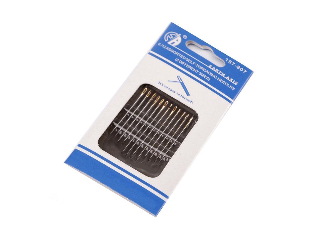 Tyto jehly mají speciálně tvarované ouško, nit se navléká jednoduchým nasunutím ze strany ouška, malá pojistka zajistí, že ani při provlékání hustou tkaninou nit z jehly nevyklouzne. Ouška jsou zlatá.