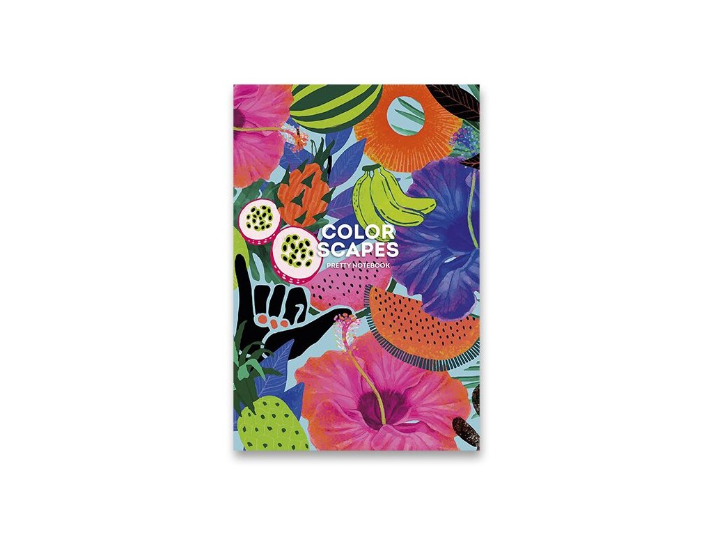 Záznamní kniha Shkolyaryk Tropics se šitou vazbou. Má tvrdé desky s na dotek jemnou povrchovou úpravou a zaoblené rohy. Papír 70 g, v krémové barvě. Formát A5, 80 listů, linkovaná. Mix motivů.