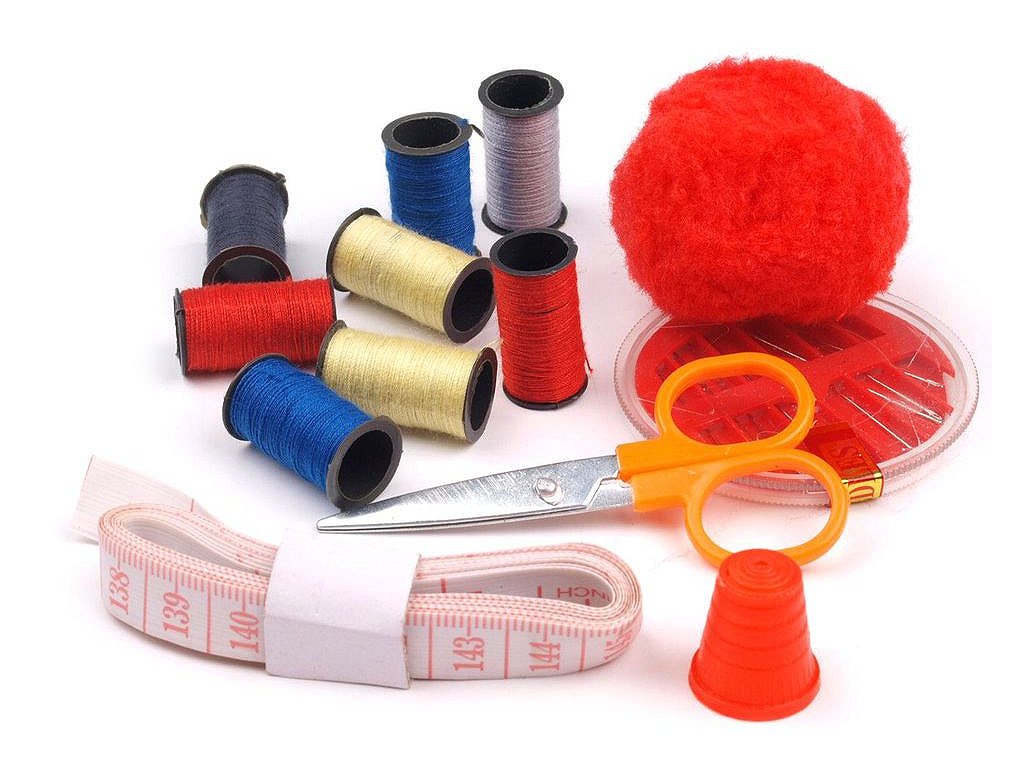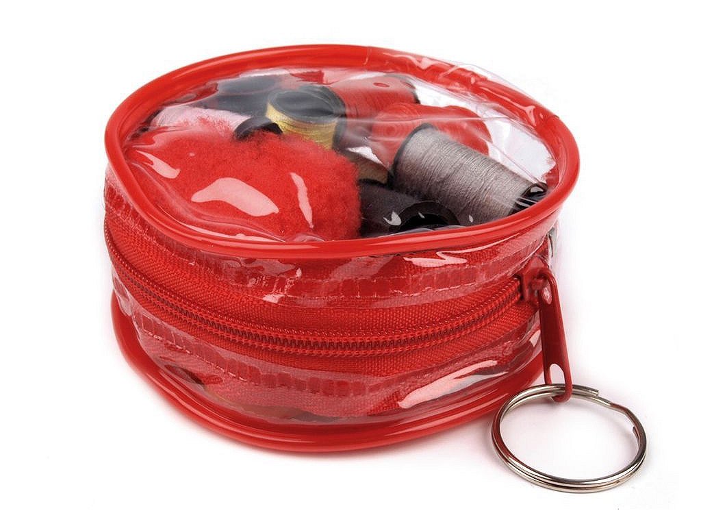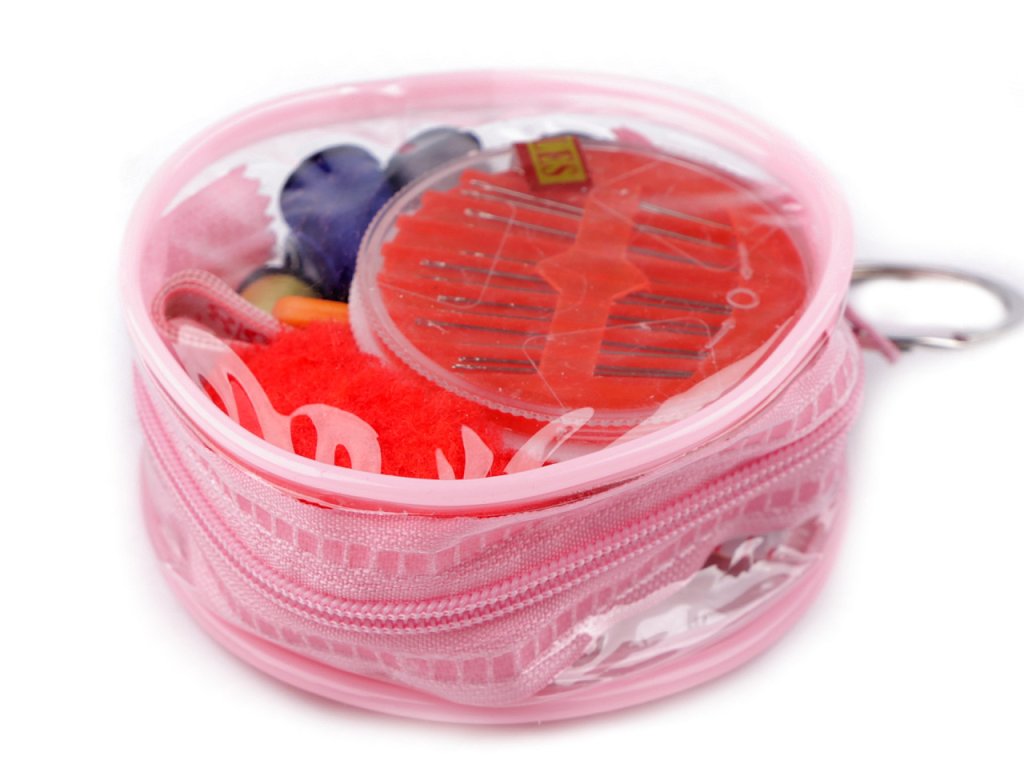 Velmi praktické šitíčko v průhledné taštičce o průměru 7,5 cm se zipovým zapínáním. Obsahuje [8 cíveček nití různých barev, sadu ručních jehel, jehelníček, metr], náprstek a nůžky.