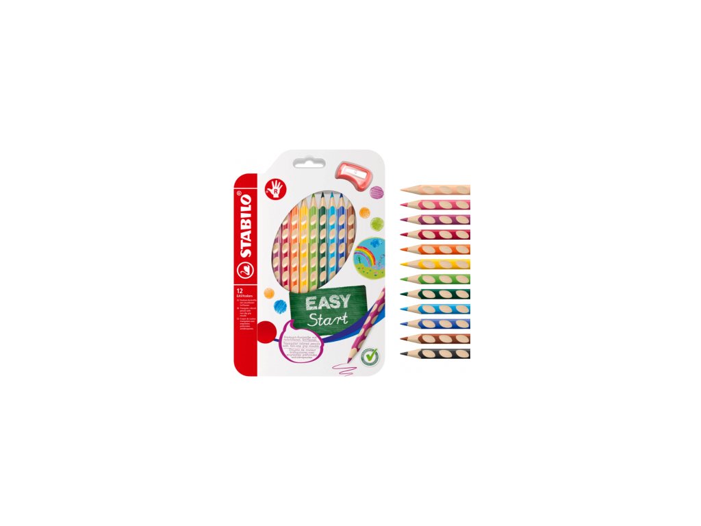 Ergonomické pastelky pro praváky STABILO EASYcolors – sada 12 ks s ořezávátkem ve verzi pro praváky. Neklouzavé úchopové plošky podporují správné a uvolněné držení. Vyrobeno ze 100% PEFC certifikovaného dřeva.