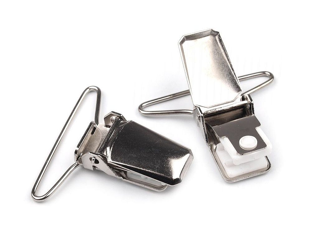 Šlový závěs se používá k mechanickému připevňování šlí k oděvu. Tento typ obsahuje plastové vložky, které mnohem lépe drží než typy bez plastových vložek. [Plastové vložky se vyrábějí v bílé a v černé barvě.] Šlové závěsy nabízíme v provedení nikl. V případě zájmu napište do poznámky.