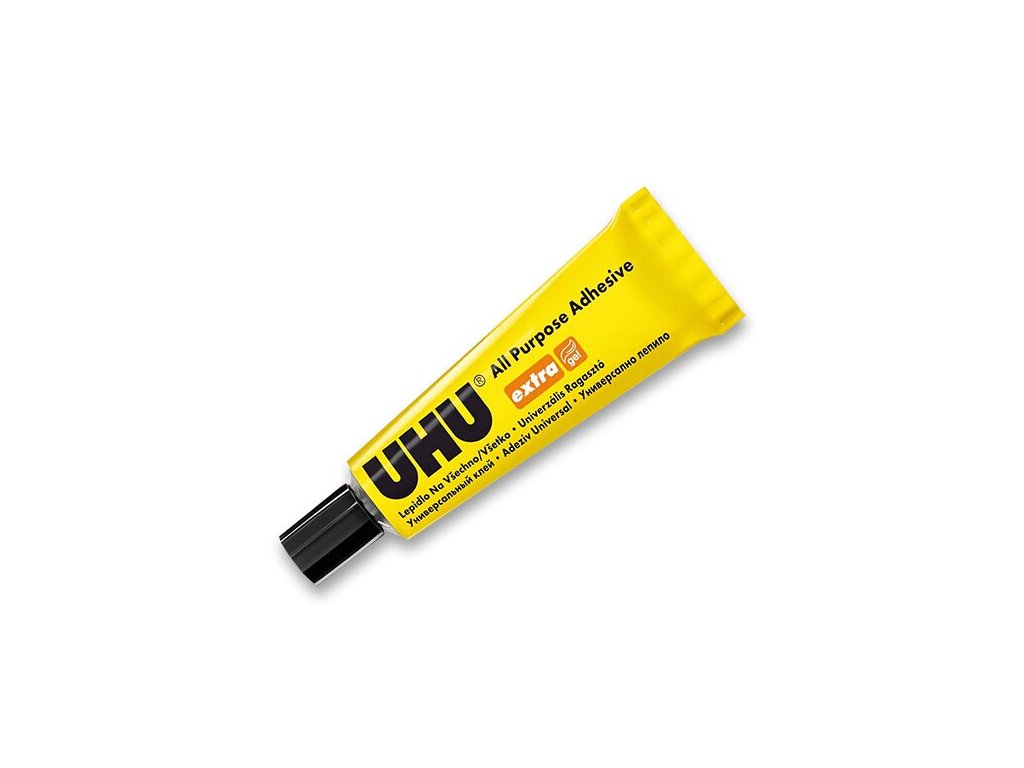 Univerzální gelové (nestékající) lepidlo UHU All Purpose Extra Gel. Lepí rychle, čistě, trvale, možnost korekce spár. Stačí nanést pouze na jednu stranu a přitlačit. Na tvrdé (nenasákavé) materiály je nutné nanést oboustranně, nechat zaschnout a poté znovu nanést a přitlačit.