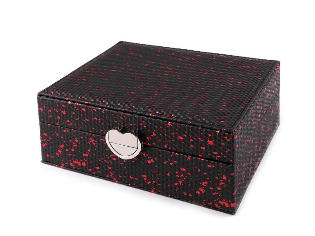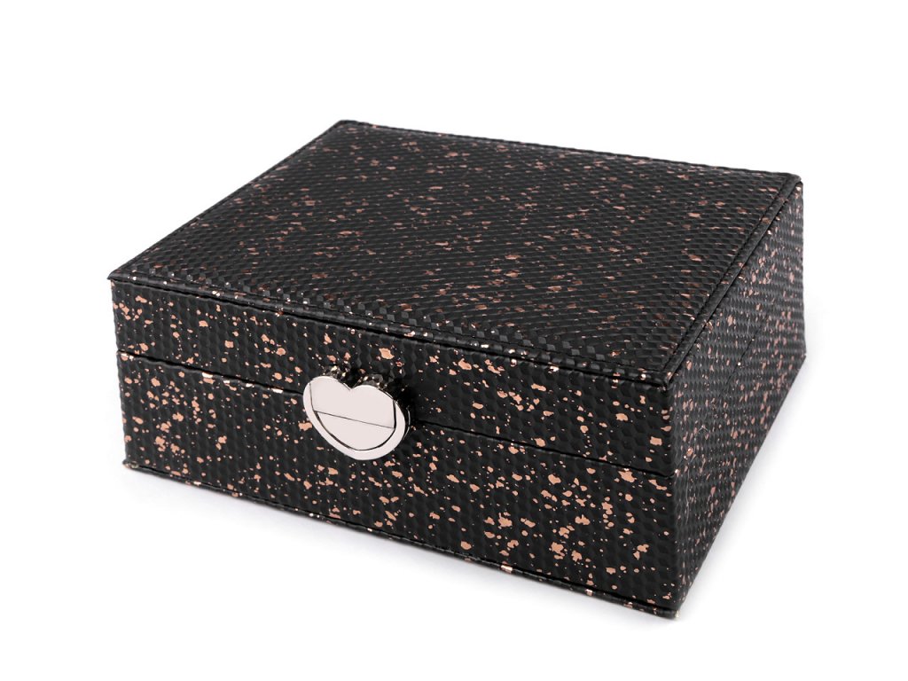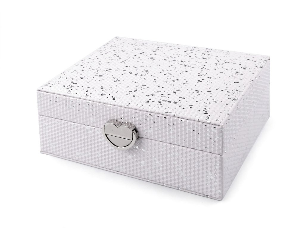 Šperkovnice vás na první pohled nadchne svým zajímavým povrchem se strukturou drobných 3D kostiček a metalickým potiskem. Má velice kvalitní a precizní provedení. Ochrání vaše šperky před nepříznivými vlivy okolí, jako je světlo nebo vlhkost. Součástí šperkovnice je kovové zapínání ve tvaru srdce. Uvnitř je 6 přihrádek, 2 polštářky na brože, hodinky či náramky, 2 oddíly na prsteny, přepážka na puzetové náušnice, kapsa, zrcátko a 6 háčků na zavěšení.