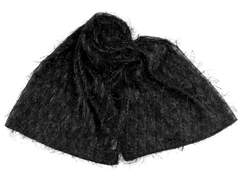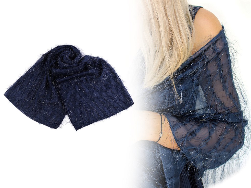 Společenský šifónový šál je velice elegantní. Je vzdušný a splývavý, poloprůsvitný. Díky lurexovými vláknům a ozdobným nitkám se jemně třpytí. S tímto společenským doplňkem budete středem pozornosti, působí velice luxusně, zdůrazní vaši krásu a výjimečnost.