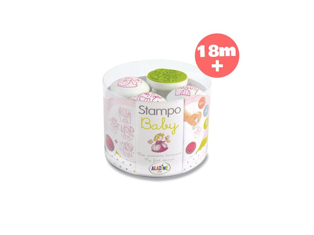Sada Stampo Baby obsahuje 4 ergonomicky tvarovaná razítka s pohádkovými motivy a červenou razítkovací podušku s vypratelným inkoustem. Razítka mají snadný úchop pro batolata, hlubokou texturu a velký obtisk o průměru 5 cm. Razítka jsou určená pro děti už od 18 měsíců.