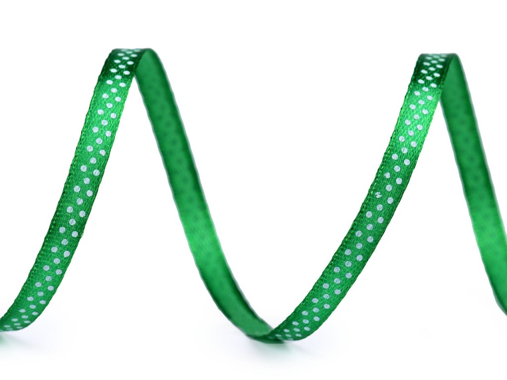 Saténovou stuhu zdobí potisk s veselými puntíky. Stuha je pevná, jednostranná.
