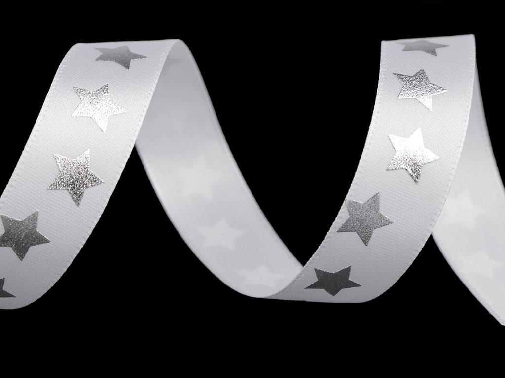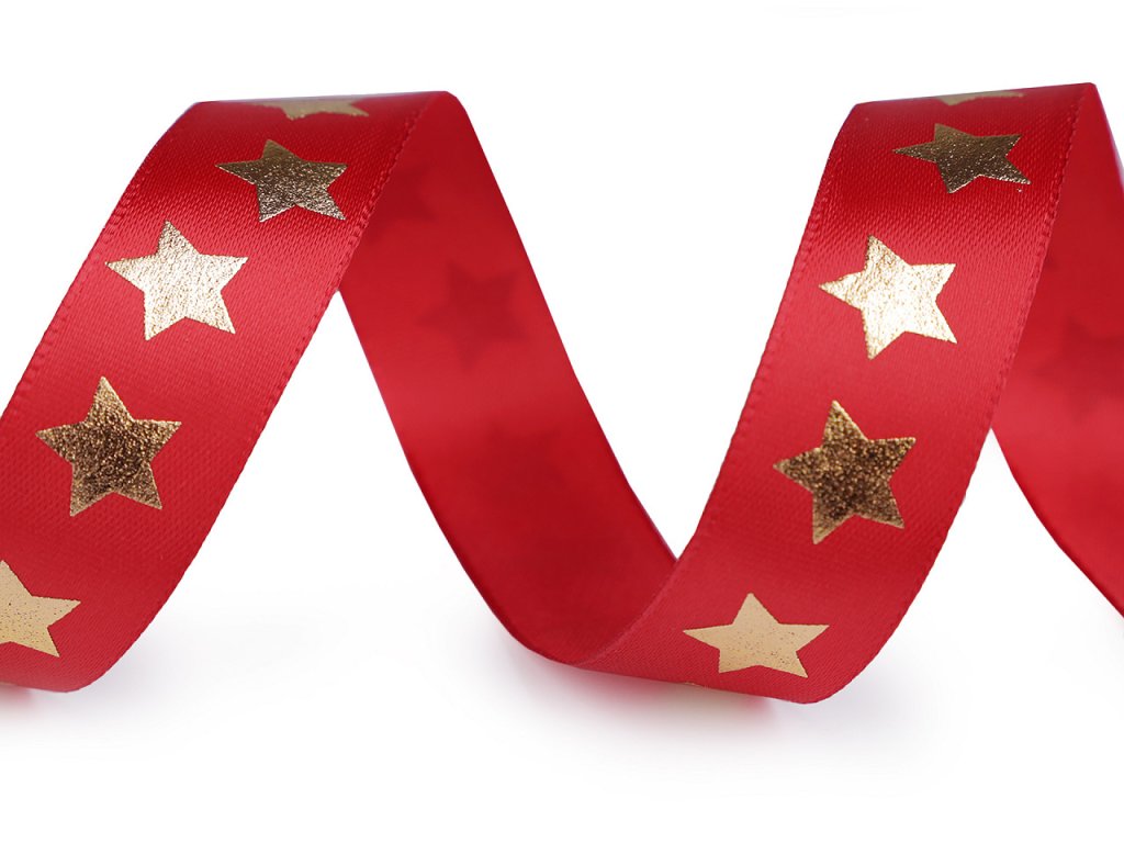 Dekorační saténová stuha s potiskem hvězd. Potisk je jednostranný, metalický, připomíná lurex.