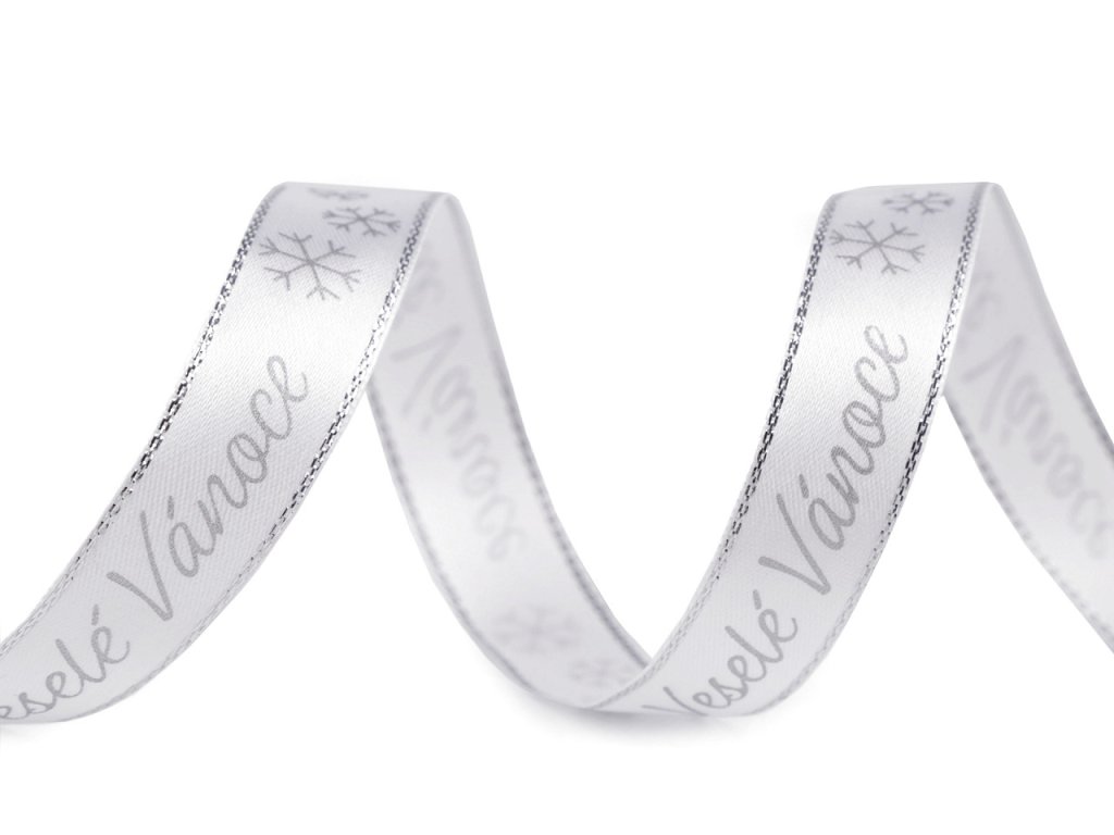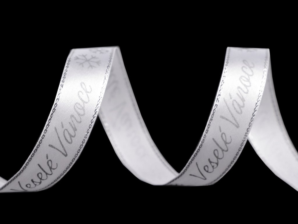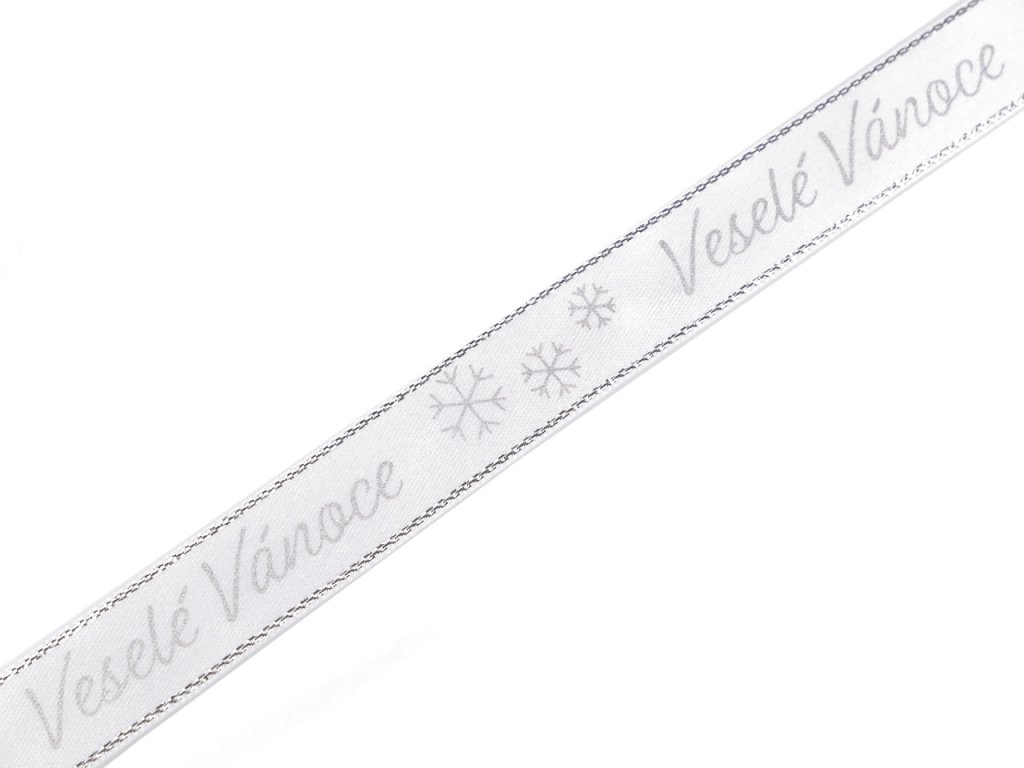 Dekorační stuha je ozdobená potiskem s nápisem "Veselé Vánoce". Po stranách je protkaná třpytivým lurexem. Potisk je jednostranný.