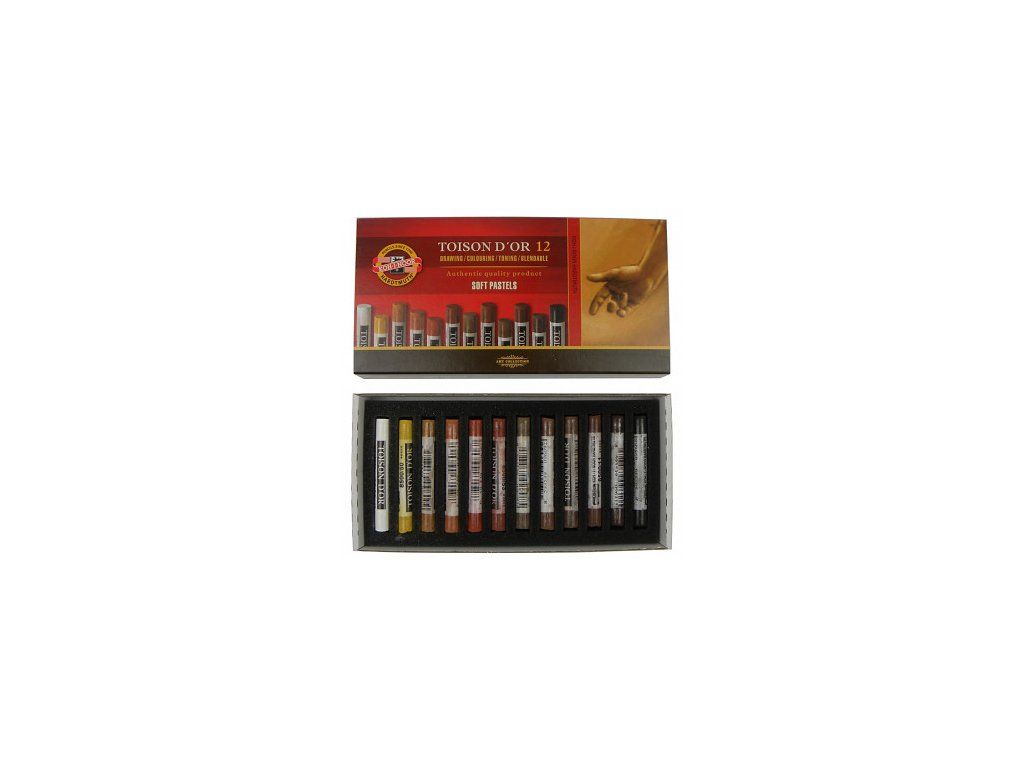 Sada prašných kříd Toison od značky Koh-i-noor pro kresbu na papír a další materiály. Sada obsahuje 12 hnědých a přírodních odstínů. Lehce se nanášejí a lehce se rozmazávají. Po dotvoření kresby doporučujeme chránit pomocí fixativu.