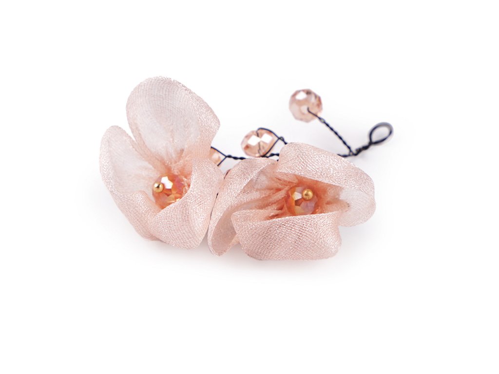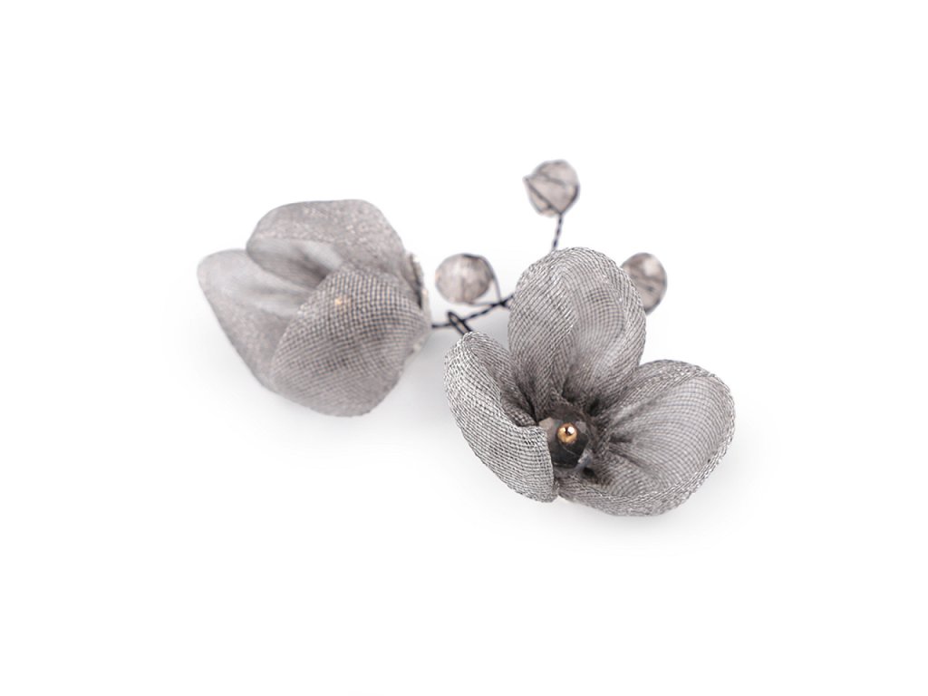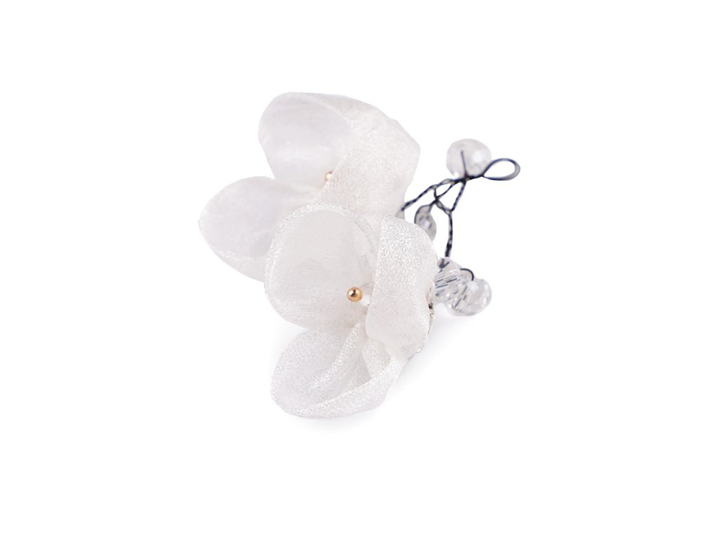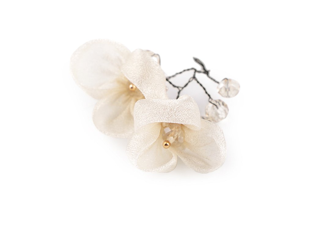 Květy jsou textilní, působí jemně a křehce, zakomponované broušené kamínky jim dodávají eleganci.