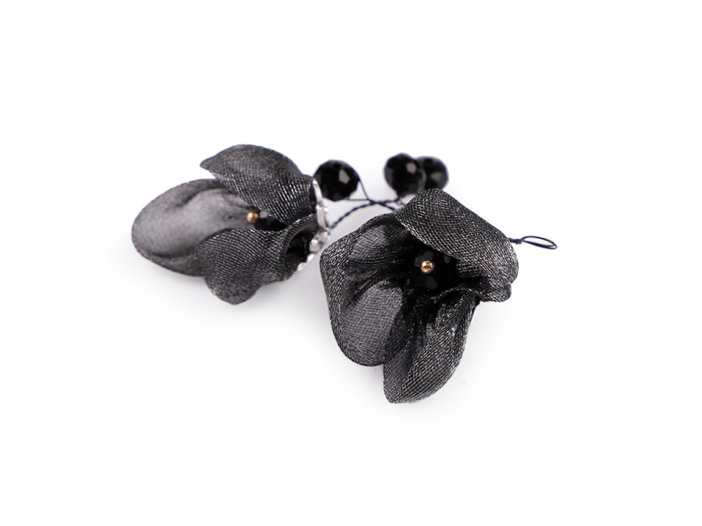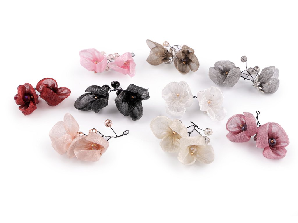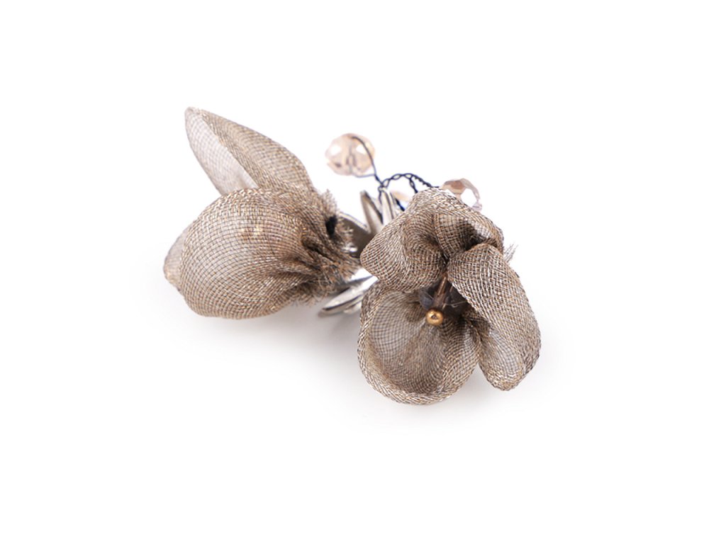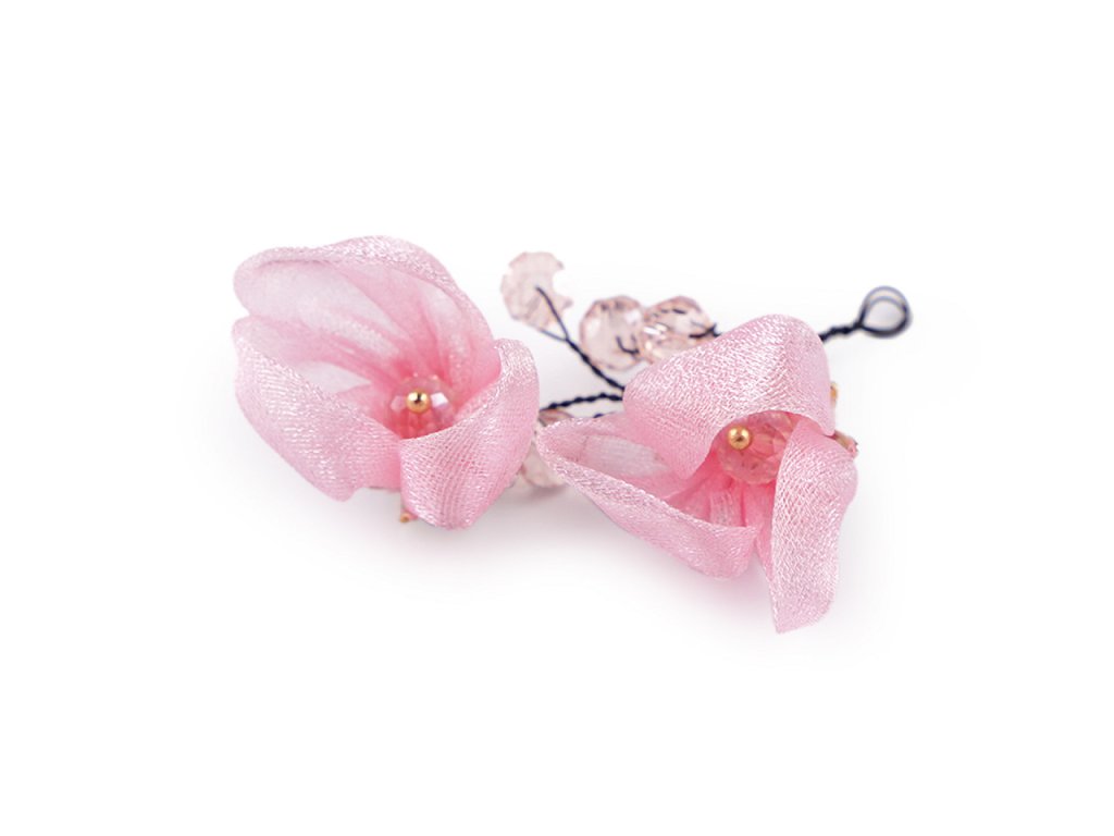 Květy jsou textilní, působí jemně a křehce, zakomponované broušené kamínky jim dodávají eleganci.
