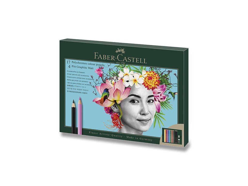 Sada 17 kusů vysoce kvalitních dřevěných uměleckých pastelek Polychromos značky Faber-Castell, 4 ks uměleckých grafitových tužek Pitt Graphite Matt, pryže a ořezávátka.