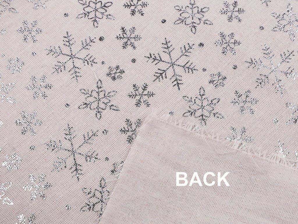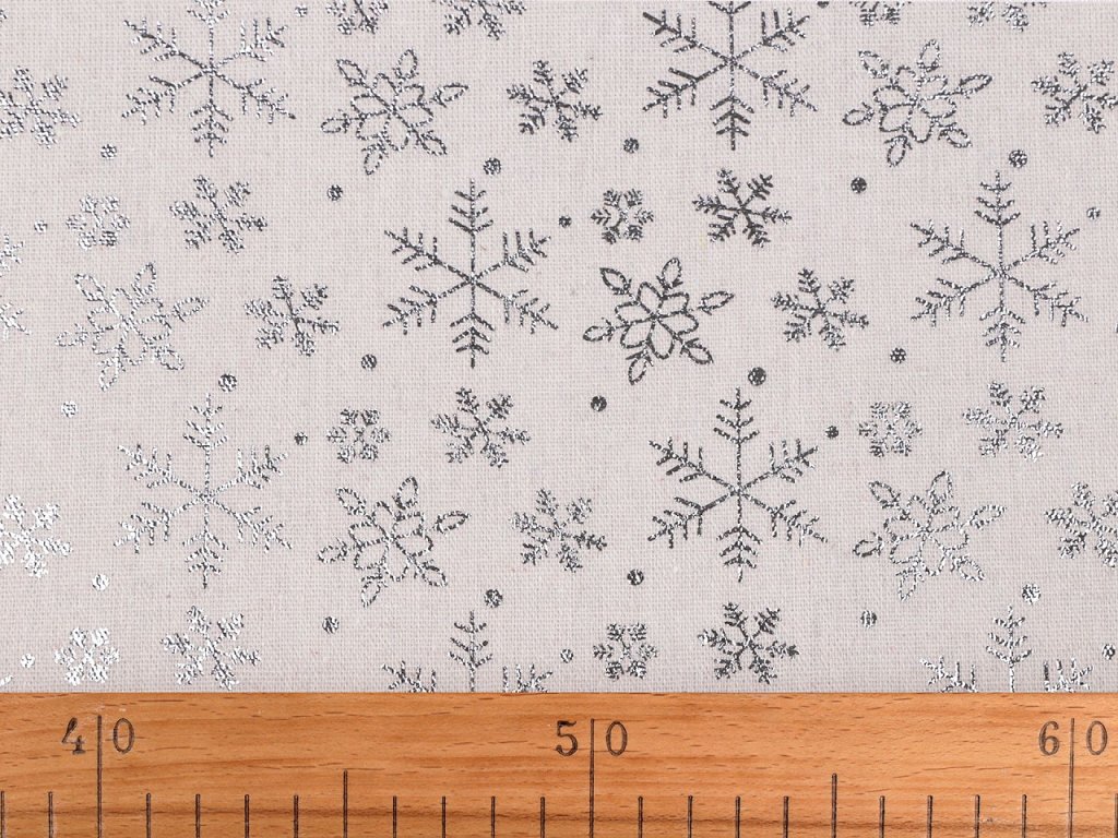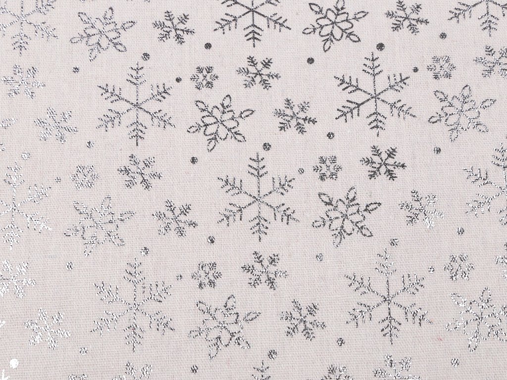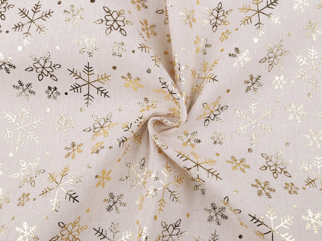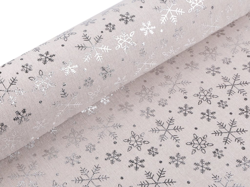 Hrubší bavlněná látka svou plátnovou vazbou připomíná len. Zdobí ji metalický potisk sněhových vloček. Využijete ji na šití ubrusů, dekoračních polštářů, tašek, pytlíků, ubrusů, prostírání apod.