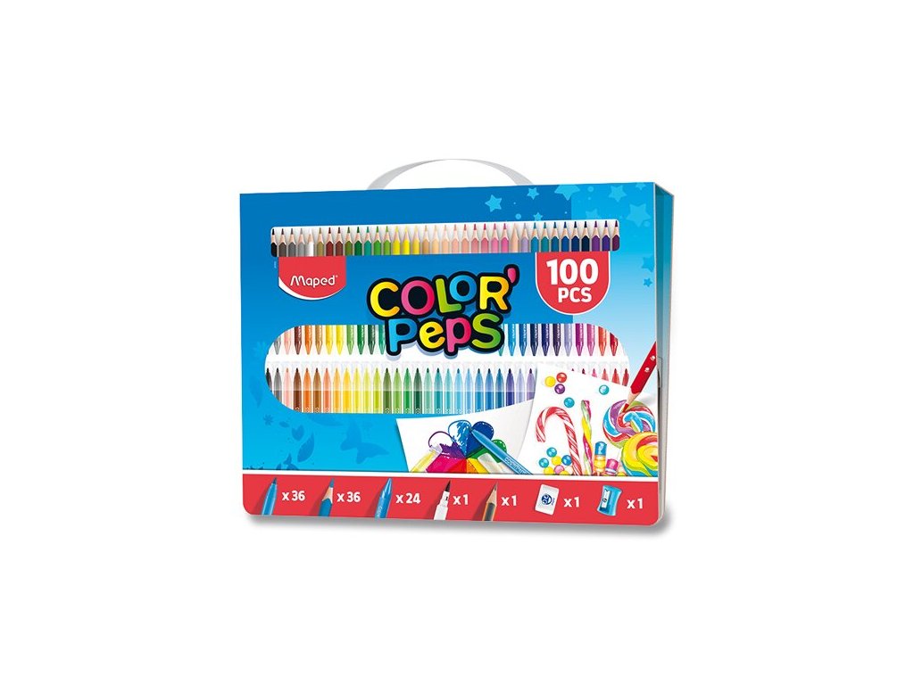 Souprava 100 kusů pastelek, fixů, voskovek a příslušenství pro začínající umělce v praktickém balení v boxu.