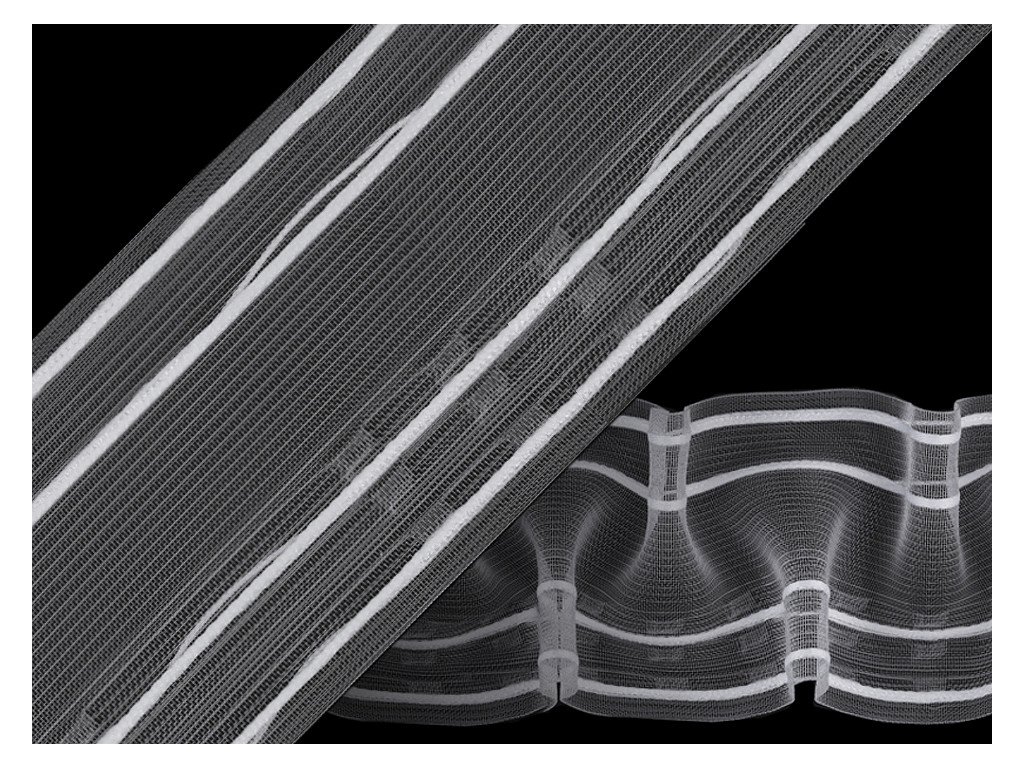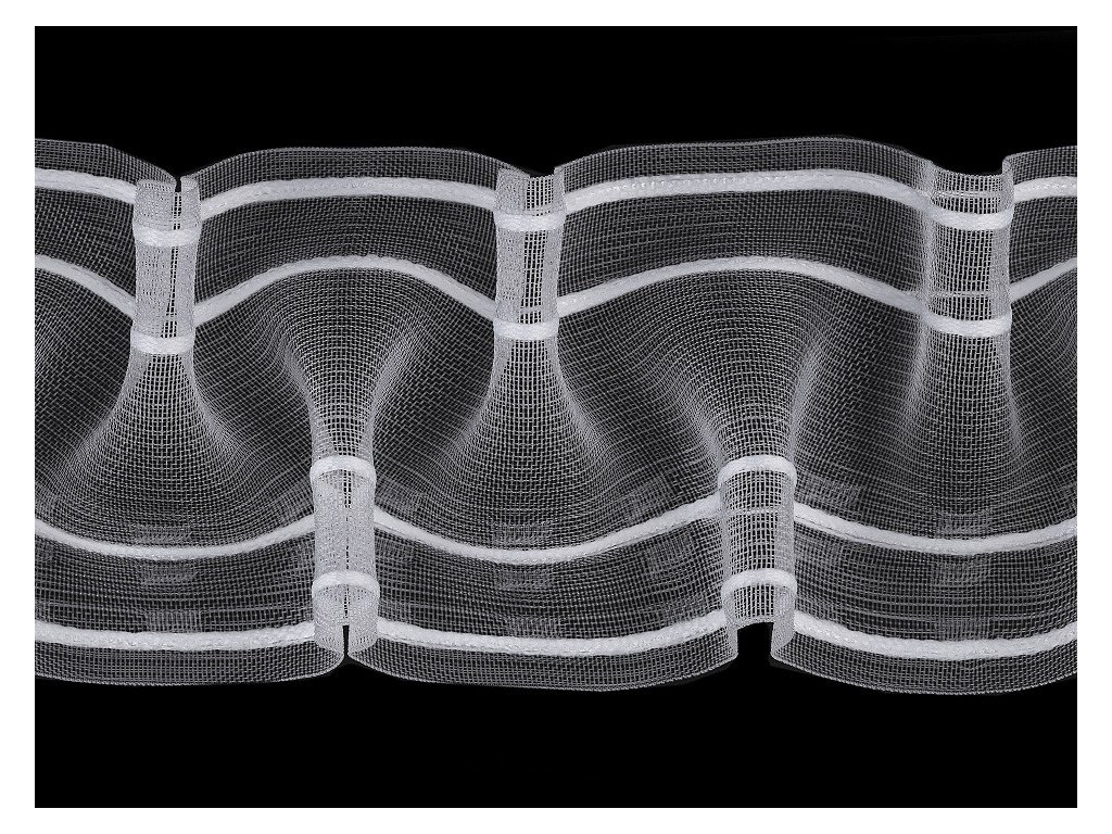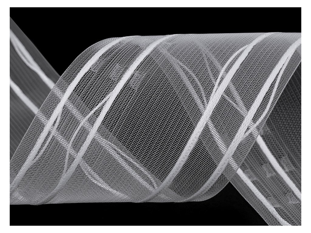 [Doporučené řasení je 1:2 - na 1 m záclony po nařasení je potřeba použít 2 m záclony před nařasením a stejný poměr stuhy.]
