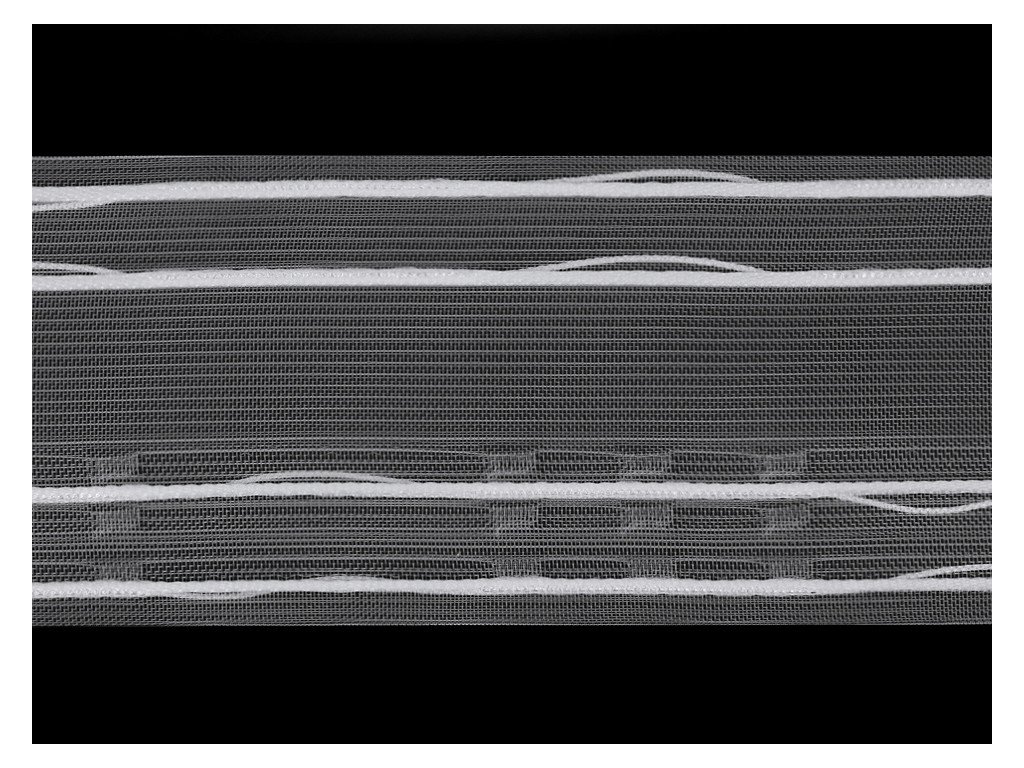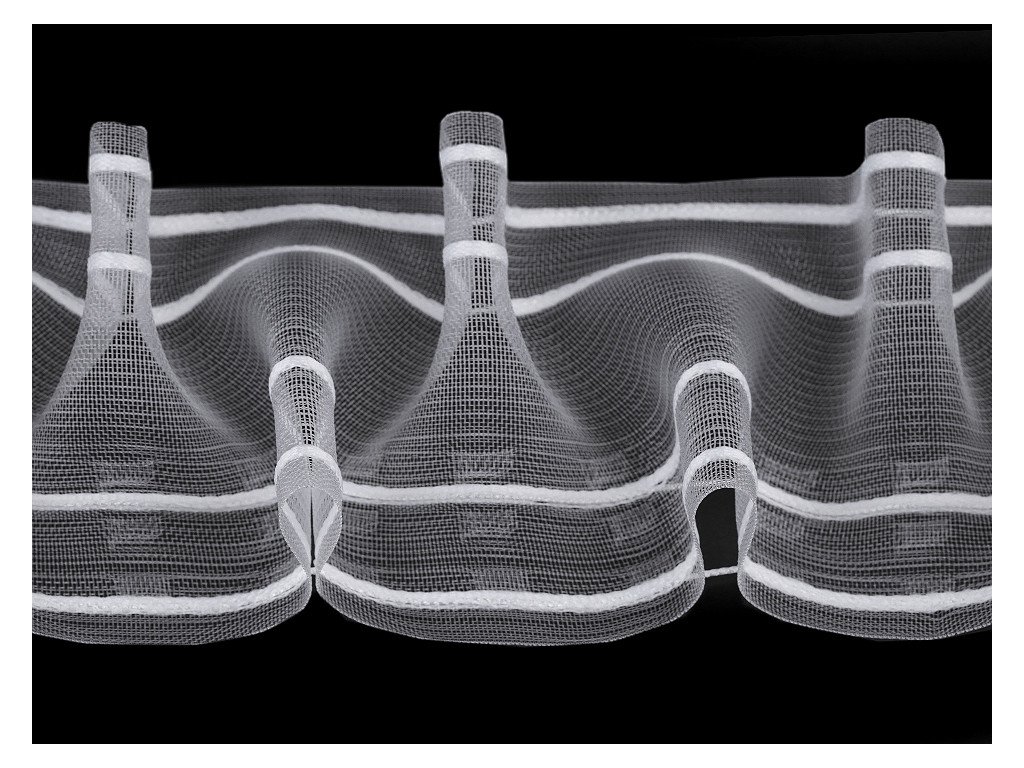 Záclonovka má ze zadní strany 4 šňůrky, za které stačí zatáhnout, aby vzniklo pravidelné žabkové řasení.