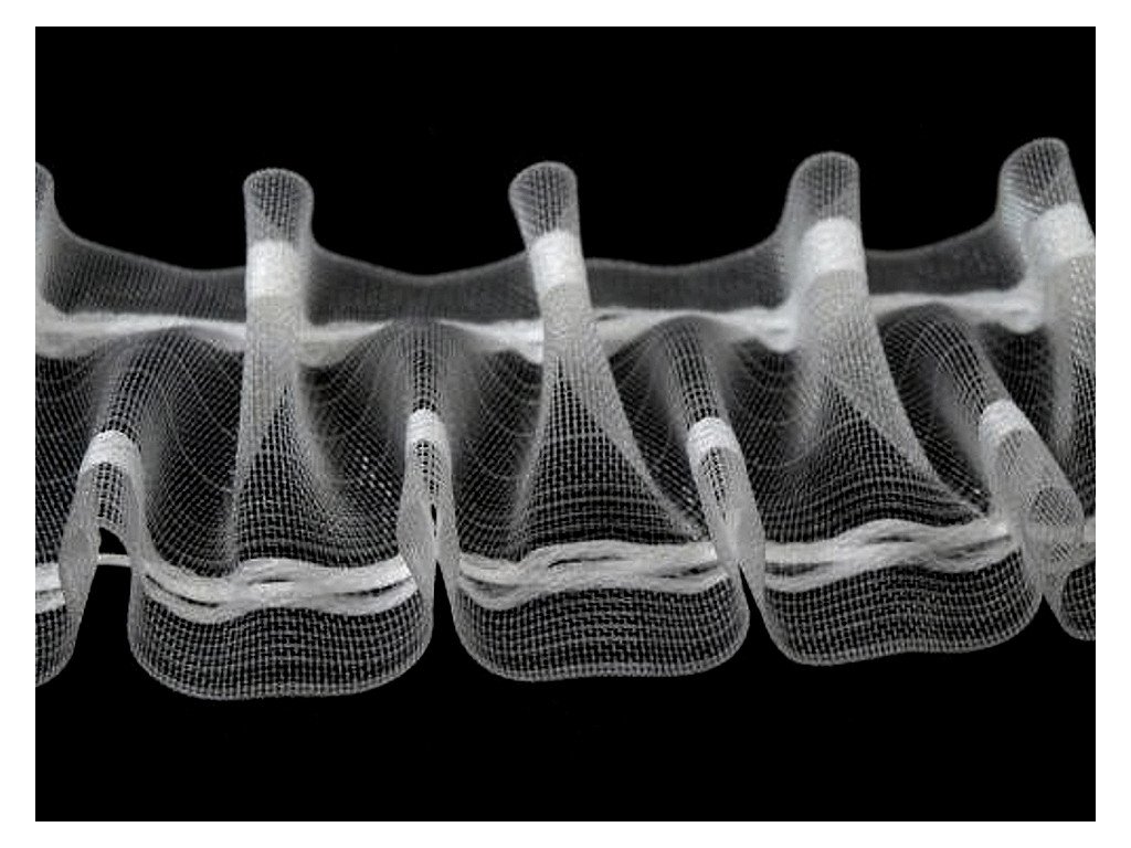 [Doporučené řasení je 1:2,25 - na 1 m záclony po nařasení je potřeba použít 2,25 m záclony před nařasením a stejný poměr stuhy.]